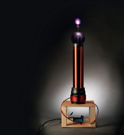 Суть изобретения Теслы проста. Если питать трансформатор током с частотой, равной резонансной для его вторичной обмотки, напряжение на выходе возрастает в десятки и даже сотни раз. Фактически оно ограничено электрической прочностью окружающего воздуха (или иной среды) и самого трансформатора, а также потерями на излучение радиоволн. Наиболее известна катушка в области шоу-бизнеса: она способна метать молнии!