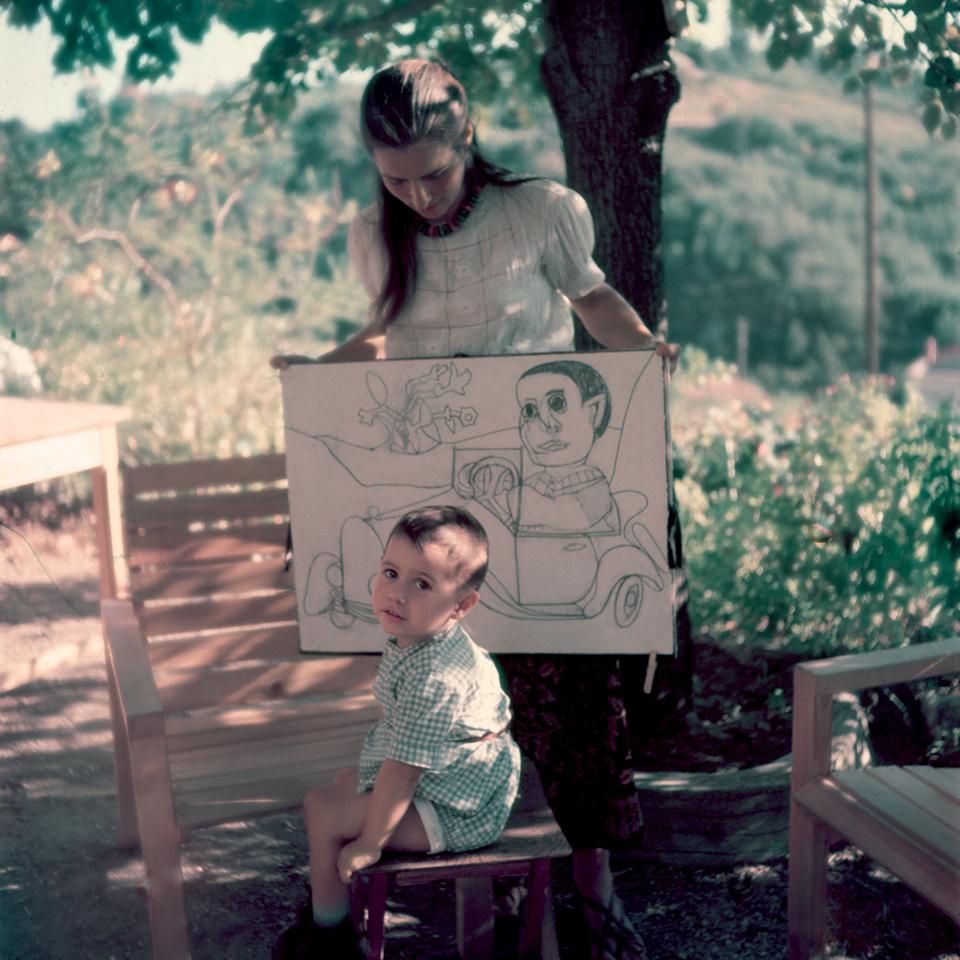 Франсуаза Жило с сыном Клодом и рисунком Пабло Пикассо, 1949.