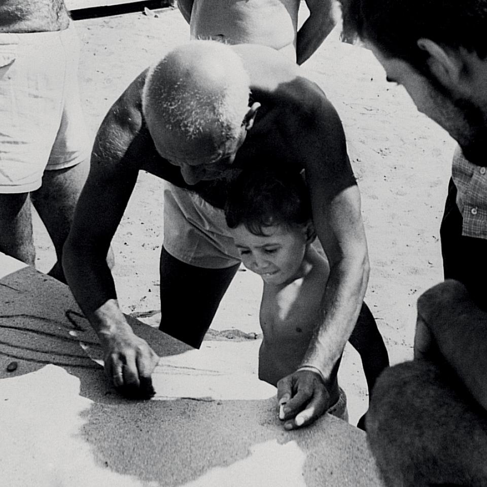 Пабло Пикассо с сыном Клодом рисует голубя на пляже в Валлорисе, 1950.