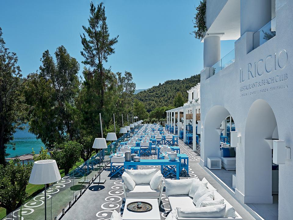 В прошлом году тонкие серебристые буквы нарисовались сразу в двух местах турецкого берега: при отеле D‑Hotel Maris на полуострове Датча и в укромной бухте недалеко от Бодрума, где при ресторане открылся еще и одноименный отель. Многие ходили удобным яхт-маршрутом между эгейским побережьем Турции и греческими островами — пейзажи в этих местах невероятные, причем на обеих сторонах. К причалу турецкого Il Riccio швартуются любители отдыхать подальше от любопытных глаз. Всего десять номеров — из них шесть сюитов. Интерьеры выполнены в строгом соответствии со стилистикой Capri Palace. Обивку для мебели заказывали у Loro Piana и Rubelli, занавески — в La Bottega dei Tessuti, керамическую плитку — в мастерских амальфитанского побережья, туалетные принадлежности — в Bvlgari.