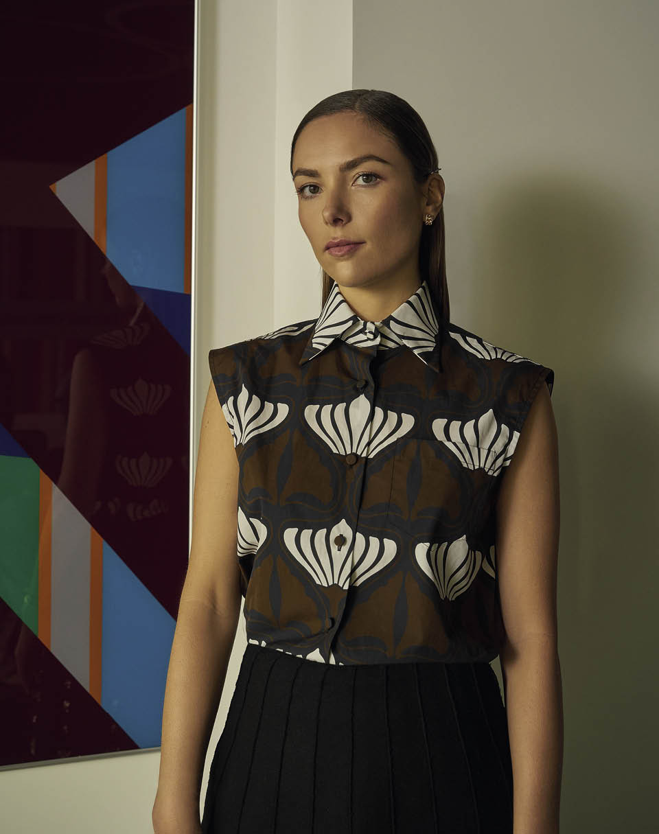 На стене: фрагмент работы Ольги Татаринцевой «Ограничение звука», 2020. Хлопковая блузка, шерстяная юбка, все Prada; золотые серьги Inspired by Twombly с бриллиантами, Graff.
