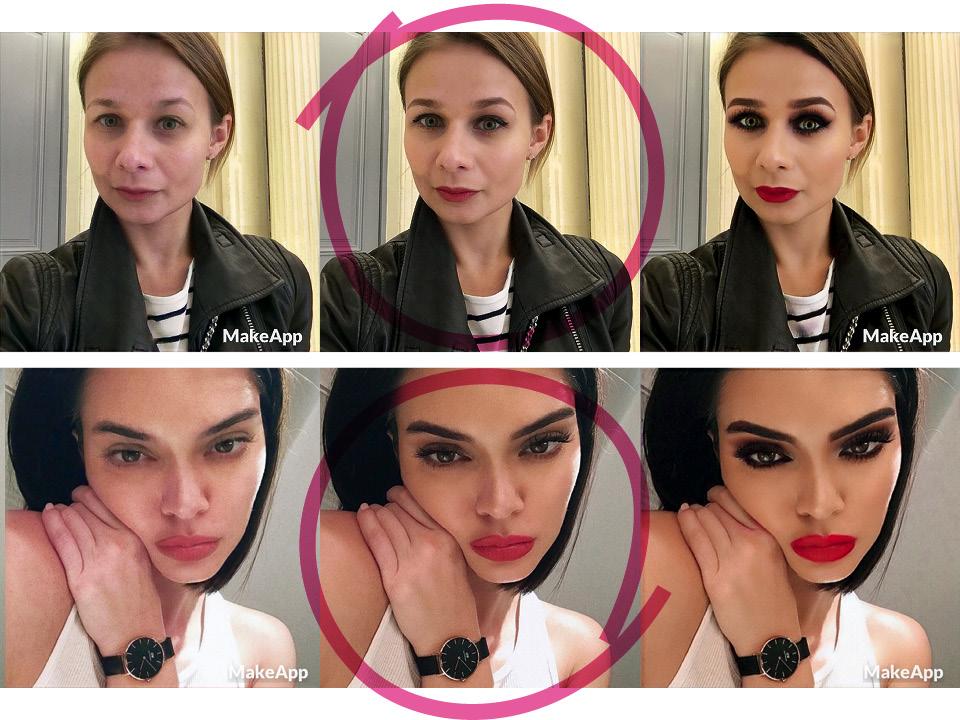 Ксения Щеглова загрузила в приложение MakeApp свое селфи. Наверху в центре — ее фото с макияжем без компьютерной обработки. Слева — телефон стер с ее лица косметику (почему-то добавив пару десятков лет), справа — предложил свой вариант. Для сравнения внизу аналогичная процедура с фотографией модели Кендалл Дженнер.