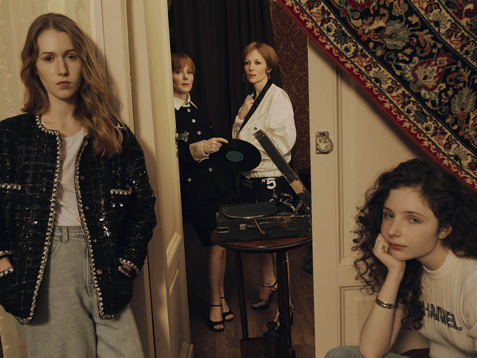 Студентка Оксфордского университета Надежда Каменькович, актрисы Полина и Ксения и ученица 57-й школы Лидия Кутеповы. На Надежде: жакет из полиэстера, хлопка и шелка, Chanel; хлопковая футболка, Incanto; джинсы, Levi’s. На Полине: платье из полиамида, акрила и хлопка, замшевые босоножки, все Chanel. Здесь и далее: кольцо Bouton de Camélia из белого золота с бриллиантами. На Ксении: шелковый жакет, хлопковая юбка, кожаные босоножки, все Chanel; серьги Extrait de Camélia из розового золота с бриллиантами. На Лидии: хлопковая футболка, Chanel; джинсы, Levi’s. Здесь и далее: браслеты Coco Crush из белого и желтого золота с бриллиантами. Все украшения Chanel Fine Jewelry.
