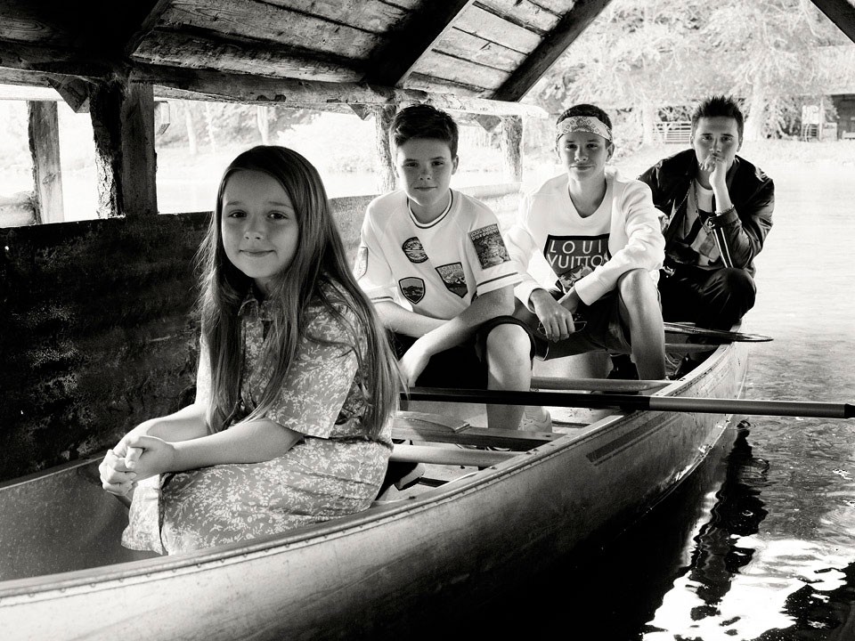 На лужайке особняка в Котсуолд-Хилс идет перестрелка. Круз надел повязку на голову, как ниндзя, и с водяной базукой ведет неудержимое наступление. Его могучий брат Бруклин отстреливается. Ромео элегантно уворачивается от брызг — этот парень в любой ситуации стабильно крут. Харпер, в простеньком полосатом платьице, рада возможности поучаствовать в безобразии. На поле выходит их знаменитый папа Дэвид, и через секунду его богатая коллекция татуировок уже отлично читается под мокрой белой футболкой. В центре композиции — Виктория: прекрасная, безмятежная, она не собирается менять тщательно выстроенную для кадра позу.