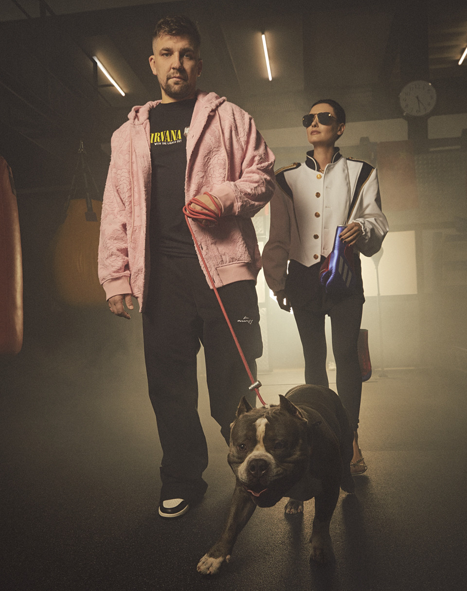 Василий и Елена со своим американским бульдогом Персиком. На Василии: хлопковый кардиган, Prada; хлопковая футболка, Other. Здесь и далее: кожаные кроссовки, Nike. На Елене: жакет из хлопка и шерсти, солнцезащитные очки, все Louis Vuitton; шорты из полиамида и боксерские перчатки, все Adidas; легинсы из полиамида, Nike; кожаные босоножки, Jimmy Choo.