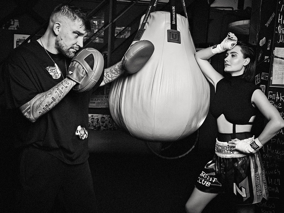 Василий Вакуленко (Баста) с женой Еленой Пинской в боксерском клубе Bupas Gym. На Василии: хлопковая футболка, Raf Simons; серебряная подвеска Kingdom Come, Saint Bones. Здесь и далее: хлопковые брюки, Martine Rose. На Елене: боди из хлопка и полиамида, Gucci. Здесь и далее: боксерские бинты, Leone.