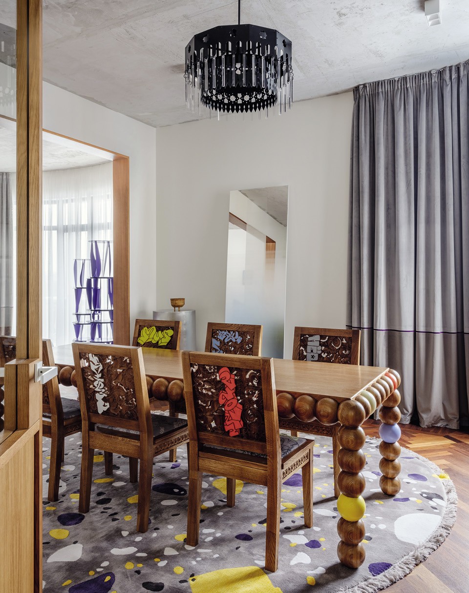 В столовой: резная мебель из дуба — коллаборация Гарри Нуриева и художников из группы A.D.E.D.; светильник — продолжение коллекции, которую Нуриев показывал в 2017‑м на Design Miami; ковер с рисунком «терраццо» сделан Crosby Studios на заказ.