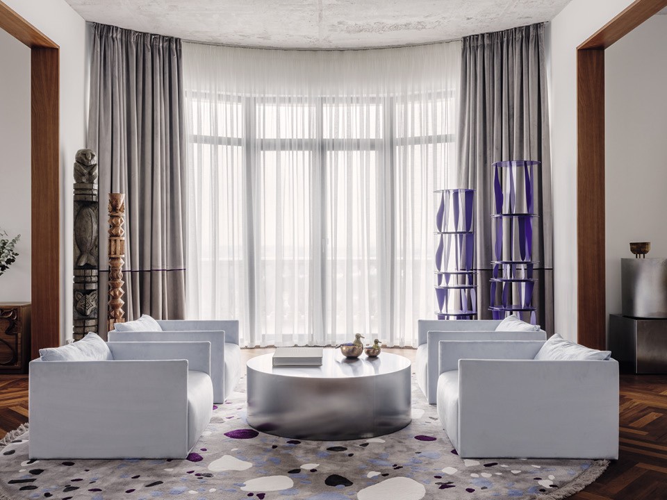 В гостиной: фиолетовые этажерки (Гарри Нуриев для Opening Ceremony) рифмуются с двумя деревянными тотемными столбами.