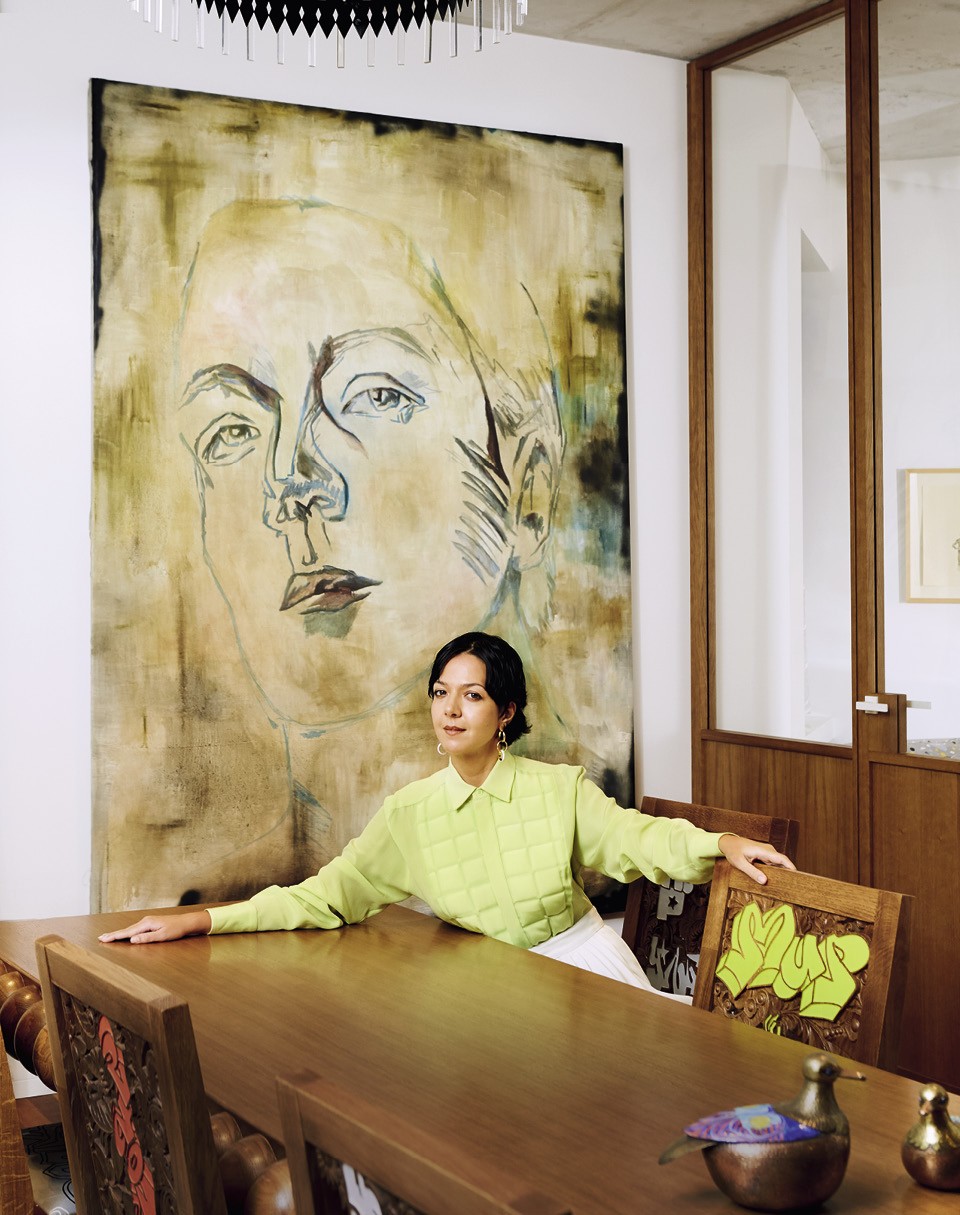 Ксения Чилингарова (Arctic Explorer) в столовой на фоне своего портрета работы Марии Качаравы. Шелковая рубашка, Bottega Veneta; кожаные кюлоты, Vika Gazinskaya.