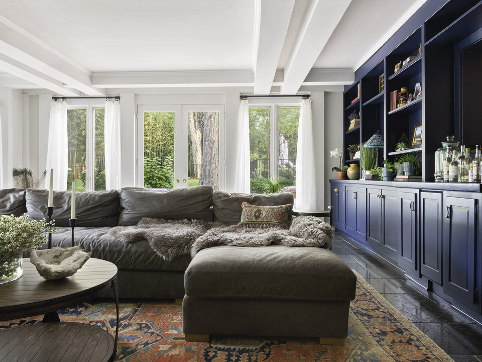 Площадь дома — триста тридцать семь квадратных метров, четыре спальни. Будущей хозяйке понравилось, что все устроено как шале в ее родных Скалистых горах: «Первой мыслью, как только я вошла сюда, было «я дома!». Парадная дверь — ярко-красное пятно на сером фасаде — ведет в гостиную со стенами из спилов бревен, оригинальными дубовыми полами и облицованным камнем камином. «Я называю ее комнатой Ральфа Лорена, потому что она напоминает мне дом Ральфа в Теллурайде. Никогда там не была, но обожаю». Хилл купила в гостиную обитые овчиной кресла Pottery Barn и коричневый кожаный диван Chesterfield от Sarreid и заставила их сочетаться с эклектикой из секонд-хендов и семейными реликвиями. В Нэшвилле многие так или иначе связаны с искусством, и Тейлор Хилл дала им возможность заработать — купила картины у художников, перетрясла антикварные магазины. Большинство ковров в доме — антикварные, от Southern Loom, компании из Остина, которую Тейлор нашла в инстаграме (соцсеть признана в РФ экстремистской и запрещена).