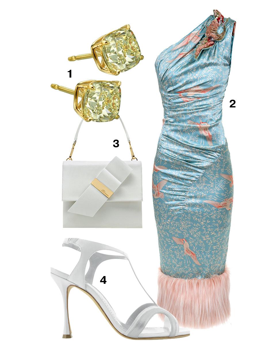1. Зо­ло­тые серь­ги с брил­ли­ан­та­ми, Yanush. 2. Шел­ко­вое пла­тье, око­ло 40 000 руб., Elisabetta Franchi. 3. Ко­жа­ная сум­ка, око­ло 29 000 руб., Blumarine. 4. Ко­жа­ные бо­со­нож­ки, 55 000 руб., Manolo Blahnik.