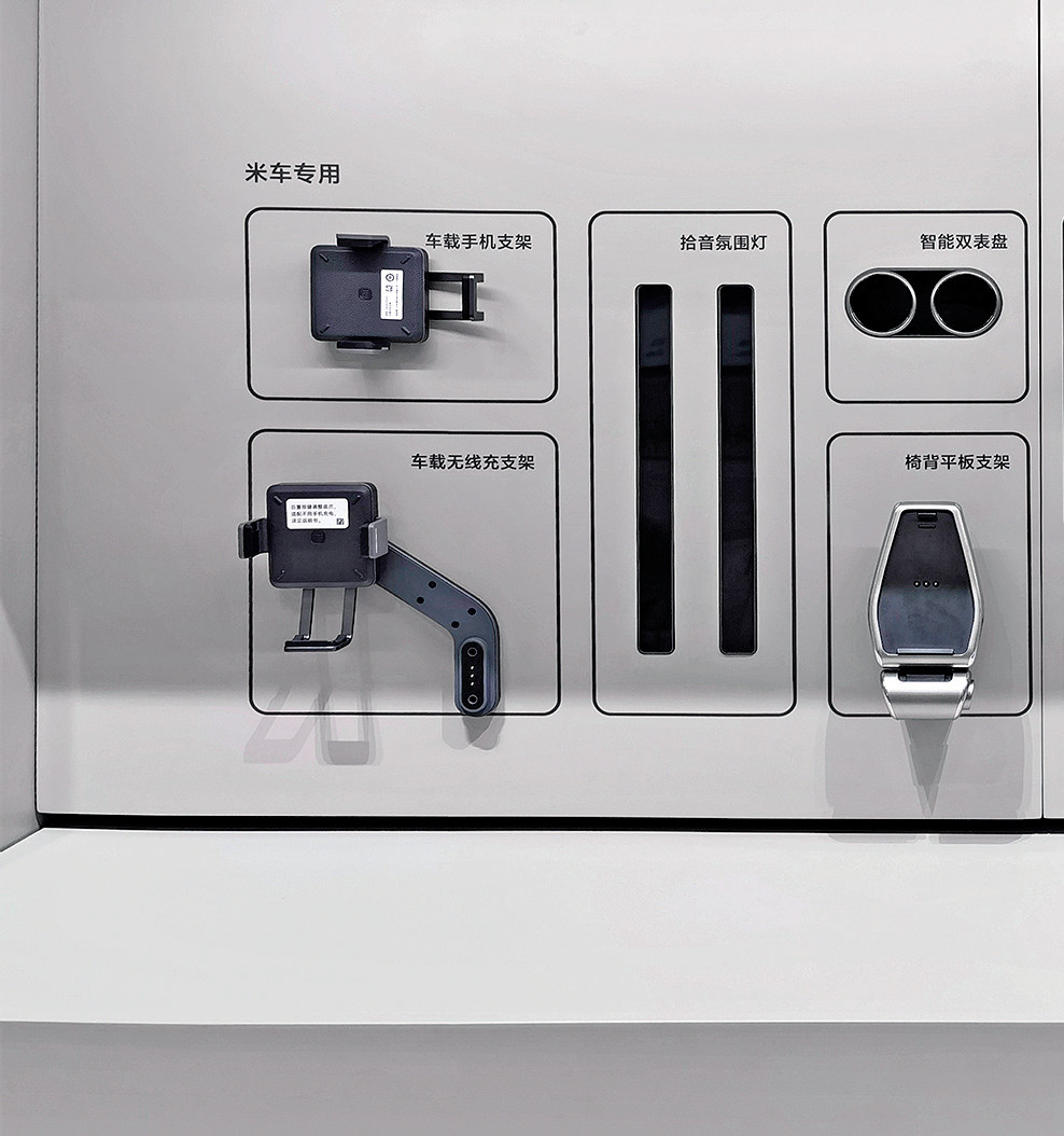 Еще одна фишка SU7 – для того чтобы добавить опции в автомобиль, нужно ехать не в сервисный центр, а в салон Xiaomi. В машине куча специальных разъемов и креплений для установки фирменных аксессуаров. В том же салоне рядом с нашим отелем ими заставлен целый стенд.