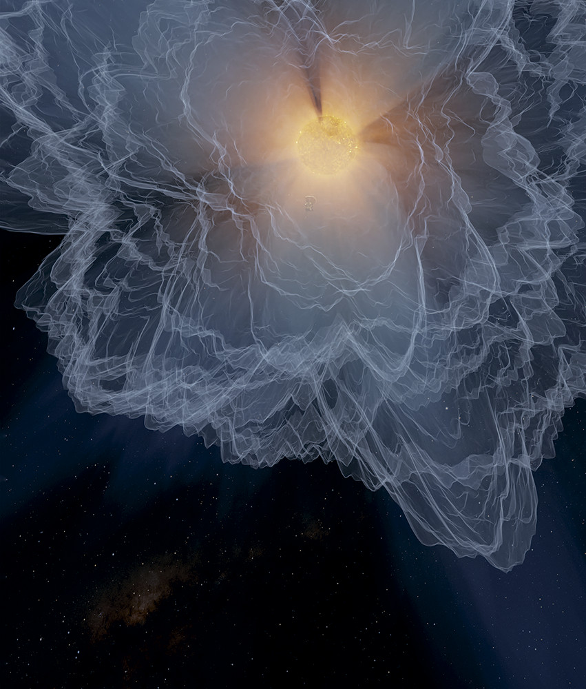Иллюстрация условно показывает границу солнечной короны, критическую поверхность Альвена. Здесь частицы солнечного ветра ускоряются настолько, что начинают двигаться быстрее, чем волны магнитного поля звезды, и навсегда покидают ее, рассеиваясь по всей системе. Поверхность Альвена располагается почти в 19 радиусах Солнца от его центра, и в 2021 году зонд Parker стал первым аппаратом, который сошелся со светилом в пределах этой границы. С тех пор он преодолевал ее еще полтора десятка раз, и сделанные в ходе пролетов измерения позволили детально определить сложную, динамическую форму призвездной области. Новая карта позволит лучше разобраться в поведении солнечного ветра и космической погоды, которую он определяет.