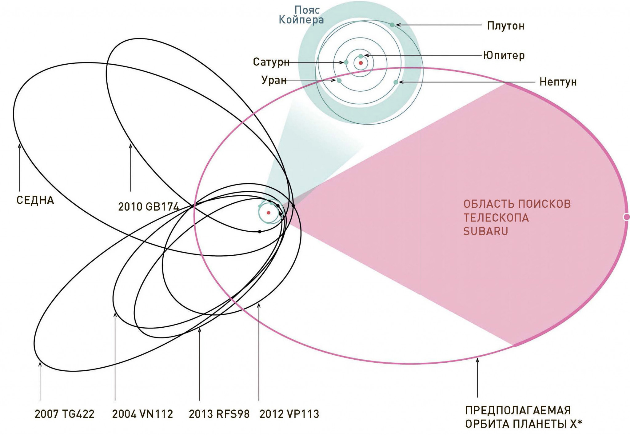 Поиски новой планеты начались более столетия назад и закончились ничем, если не считать «побочного» открытия Плутона и других транснептуновых объектов. В 1990-х годах были обнародованы данные, собранные дальним космическим зондом Voyager, которые, казалось, поставили точку в этом вопросе. Измерив орбиты всех известных планет Солнечной системы, аппарат не нашел в них никаких аномалий, которые могли бы указывать на присутствие еще одного скрытого мира. Однако тогда же на первый план вышла новая область, неизвестная астрономам прошлого, – пояс Койпера. Как раз в начале 1990-х ученые окончательно убедились, что на далекой периферии, на расстоянии, в десятки раз превышающем земную орбиту, находится разреженное скопление мелких тел. Они сохранились еще со времен формирования Солнечной системы и богаты сравнительно легкими веществами: водой, аммиаком, метаном и т.п. Плутон – самый заметный из этих объектов, но не единственный крупный: сегодня в поясе Койпера и даже за ним найдены и другие карликовые планеты, включая Эриду, Макемаке и Седну. В последние десятилетия список таких объектов быстро растет, и понемногу проступает довольно любопытная статистика. Дело в том, что обычные планеты вращаются вокруг Солнца, описывая почти ровные круги, лежащие в одной и той же плоскости эклиптики. А у многих небольших и далеких от звезды тел орбиты, напротив, сильно вытянуты. Наименьшее и наибольшее расстояние до центра – в перигее и апогее – может различаться в разы, и, двигаясь таким образом, эти объекты пересекают плоскость эклиптики, общую для «нормальных» тел Солнечной системы. Более того, перигей некоторых из них, участок максимального сближения с Солнцем, проходит через одну и ту же область пространства. Словно где-то рядом их всех вместе притягивает крупная, хоть и невидимая… планета?