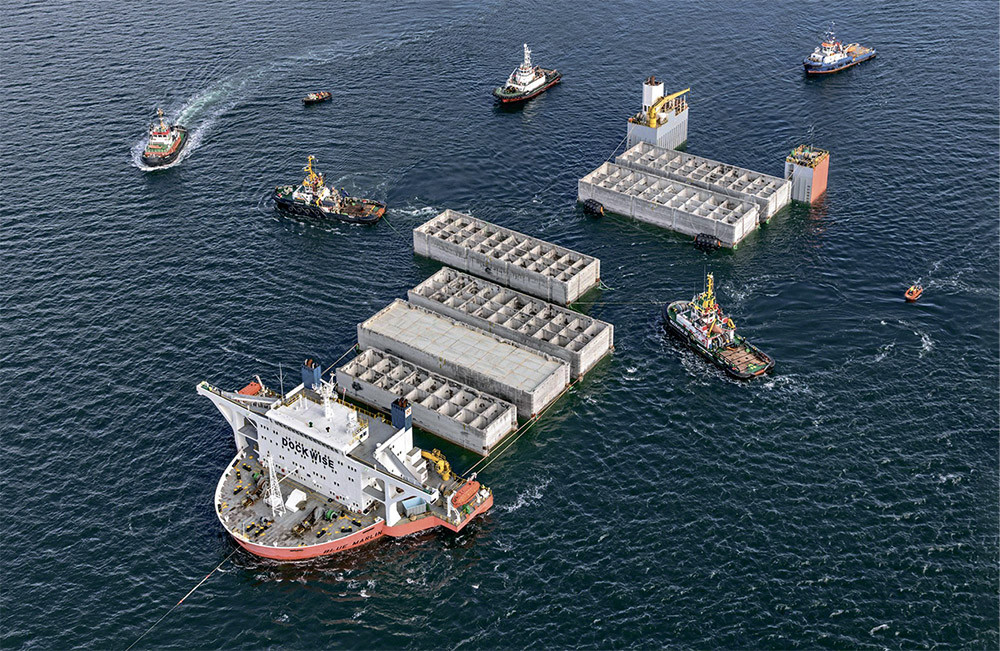 Полупогружное судно действует по другому принципу. Когда готовую платформу выводят на мелководье рядом с верфью, судно-перевозчик встает рядом и начинает заполнять свои балластные цистерны водой – до тех пор, пока ровная верхняя палуба не опустится на 15–30 м. Процесс это небыстрый, длится до 12 часов. Затем буксиры осторожно перемещают платформу, так чтобы она оказалась над палубой. Манипуляции ювелирные, требуют высочайшей квалификации персонала и тоже занимают часы. Потом начинается обратный процесс: воду из цистерн выкачивают, и судно медленно всплывает – с платформой на палубе. Все это время груз сначала надежно фиксируется буксирами, а затем намертво приваривается к палубе, и морской тяжеловоз отправляется к месту назначения. В нужной точке все повторяется в обратном порядке: сварщики убирают крепления, транспортное судно уходит под воду, буксиры отводят платформу в сторону, судно всплывает и возвращается в порт. Из-за своей специфики полупогружные суда строятся из сверхпрочных сталей и имеют очень жесткий корпус.