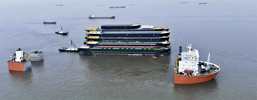 Однако в 2013 году пальму первенства у «Марлинов» отобрало другое судно – Dockwise Vanguard, на котором можно перевозить платформы весом до 117 тыс. т. Его плоская палуба без носа размером 70х275 м (на 70% больше, чем у Blue Marlin) позволяет брать грузы длиннее самого судна. Рекордсмен появился не просто так. Дело в том, что гигантские платформы к тому времени строились в Азии, на южнокорейских и китайских верфях, а доставлять их потом приходилось на месторождения в Мексиканском заливе, Северном море и у побережья Бразилии. На «Марлины» эти сооружения полностью не помещались, и верхние части приходилось достраивать на местах.