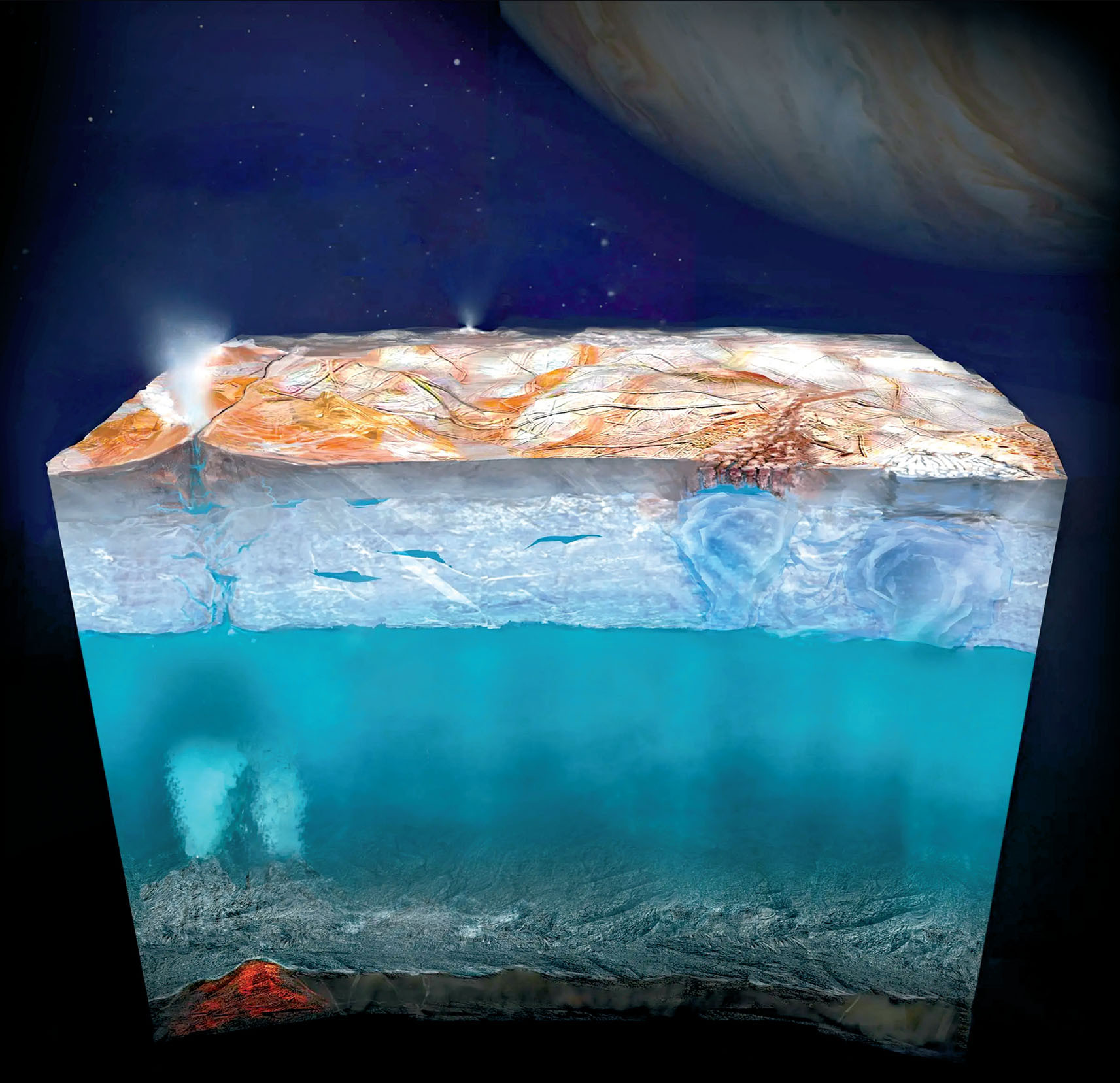 Дном скрытого океана на Европе служит ее твердое и горячее ядро. Взаимодействуя с ним, вода дополнительно нагревается и вдобавок растворяет определенное количество минералов, включая содержащие углерод карбонаты. Точный состав ядра спутника неизвестен, неизвестно и содержание в нем каменистых и металлических компонентов, однако ясно, что теоретически оно способно «оживлять» океан, снабжая его базовыми ингредиентами для жизни: жидкой водой, энергией и химическими веществами. Моделирование показывает, что в таком состоянии Европа пребывает уже примерно 4 млрд лет. А значит, там есть и четвертое важное условие, необходимое для эволюции: время.