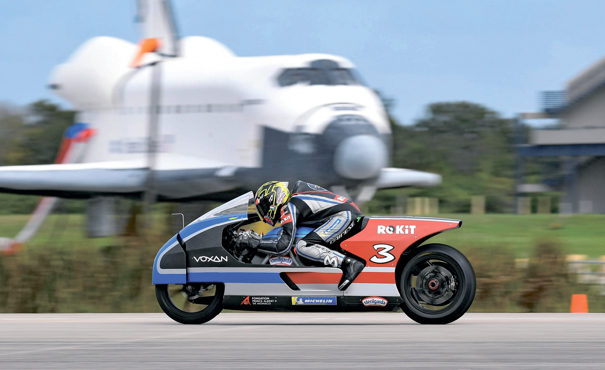 На первом плане – инновационный мотоцикл Wattman, несется на полной скорости. На фоне – космический корабль Space Shuttle, музейный экспонат, стоит на почетной стоянке. Разработанный французской компанией Voxan (ныне часть холдинга Venturi) мотоцикл использует электродвигатель от MercedesBenz мощностью до 320 кВт (435 л. с.), прочно удерживая звание самого быстрого электробайка в мире: за несколько лет он установил 11 рекордов скорости. Два из них были взяты на площадке Космического центра им. Кеннеди, когда пилотируемый Максом Бьяджи мотоцикл развил 369,626 км/ч без аэродинамической обвески, а затем 455,737 км/ч – с частичным ее использованием. Достаточно ровная и прямая трасса, подходящая для такого разгона, нашлась лишь на мысе Канаверал: 4600-метровая полоса, на которую когда-то садились космические «челноки». При этом на отдельных участках рекордного заезда бортовой спидометр Wattman, ориентирующийся на сигналы GPS, зафиксировал кратковременное достижение скорости более 470 км/ч.