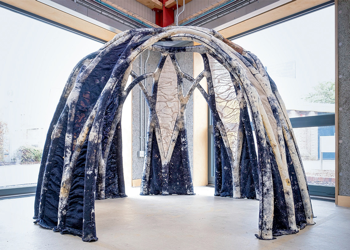 «Грибобетоном» (mycocrete) назвали новый строительный материал разработчики из британского Университета Ньюкасла. Для его получения действительно используются грибные споры, которые перемешиваются с измельченной бумагой, глицерином, водой и ксантановой камедью – полисахаридом, который сгущает все в пасту. Эту смесь вносят в пористую текстильную структуру и помещают в темное, теплое и влажное место, позволяя спорам прорасти. Затем из них вытягиваются нитевидные гифы, фиксируя текстиль в нужной форме; далее ее остается лишь высушить в определенный момент, чтобы не дать грибам созреть. Ученые продемонстрировали технологию, собрав небольшой «грибобетонный» вигвам, который можно видеть на фотографии.
