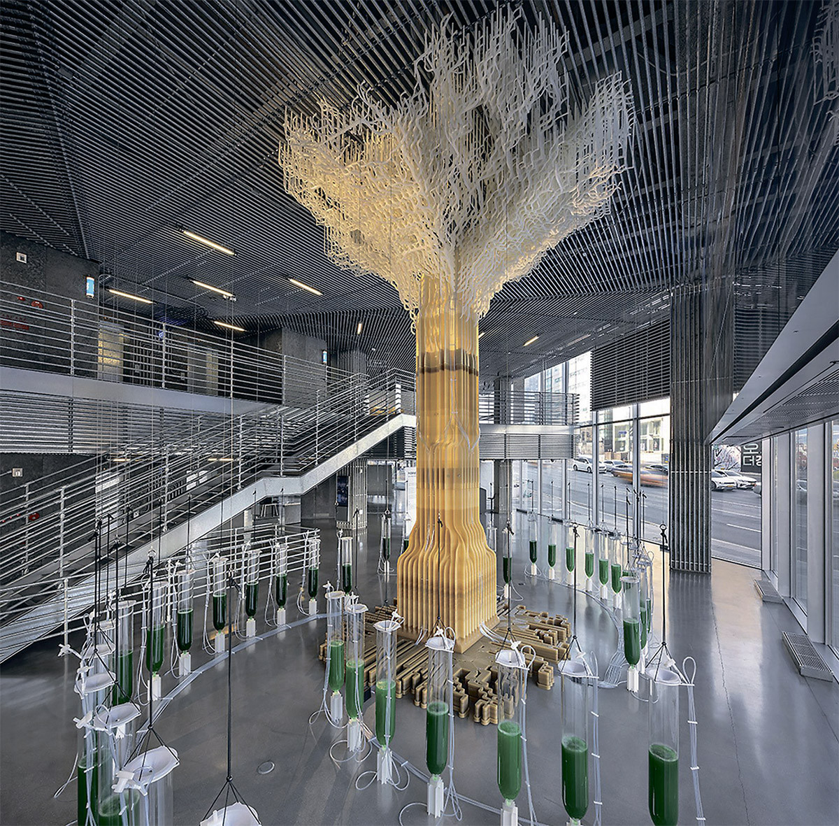 Водоросли – в биополимер, биополимер – в материал для 3D-печати, а его – в 10-метровую скульптуру превратили инженеры и дизайнеры из еcoLogicStudio. Ветвистое дерево Tree One было изготовлено по заказу Hyundai и установлено в одном из шоурумов компании в Сеуле. По задумке, вся инсталляция должна очищать воздух и демонстрировать то внимание, которое Hyundai уделяет проблеме загрязнения атмосферы. Поэтому ствол окружен массивом из 40 биореакторов, заполненных водой с цианобактериями – живыми, фотосинтезирующими и производящими чистый кислород. Раз в несколько недель реакторы приходится опустошать, заменяя воду и удаляя мертвую биомассу, которую можно превратить в экологически безопасный полимер, полимер – в материал... Ну и так далее.