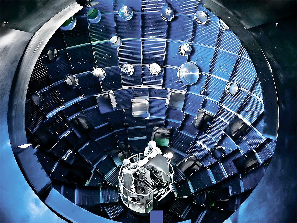 Еще в конце 2022 года физики из Национального комплекса лазерных термоядерных реакций США (NIF) объявили, что им впервые удалось получить в таком превращении больше энергии, чем было затрачено на реакцию. Однако многие детали работы были обнародованы лишь недавно: после долгого рецензирования журнал Physical Review Letters наконец опубликовал пять статей, подготовленных физиками NIF. Выяснилось, что для достижения результата ученые использовали лучи сразу 192 высокоэнергетических лазеров, сфокусированные на мишени диаметром около 1 мм – полом цилиндре с капсулой, содержащей 220 мкг дейтерия и трития. Этот цилиндр, хольраум, можно увидеть на фото слева, в центре петли, которая обеспечивает криогенное охлаждение. Под действием лазеров он активно испускал рентгеновские лучи, которые вызвали нагрев и сжатие топлива, заставив протоны сливаться. Давление при этом достигало 600 млрд атмосфер, а температура – 151 млн градусов, намного больше, чем в недрах Солнца.