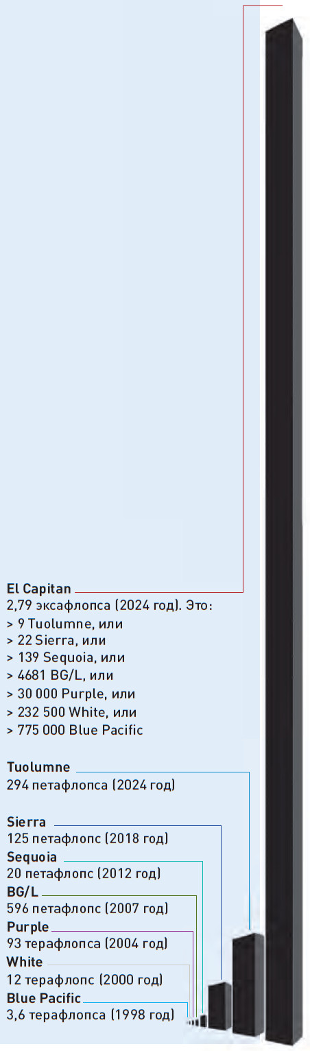 В американской Ливерморской национальной лаборатории запущен суперкомпьютер El Capitan, основной задачей которого станет моделирование ядерных взрывов. Построенная компанией Cray (часть концерна Hewlett-Packard) система наследует их же суперкомпьютеру Frontier, представленному в 2022 году, который первым преодолел планку в экса флопс – квинтиллион (миллиард миллиардов) операций в секунду. Оба они реализованы на вычислительной платформе Cray Shasta, которая позволяет использовать разные типы процессоров в одном кластере и обеспечивает высокоскоростную связь между ними. Пока в мире есть лишь три машины быстрее эксафлопса, и El Capitan стала самой мощной из них, возглавив рейтинг Top500. Однако уже в 2025 году ожидается появление нового рекордсмена – возможно, им станет строящийся в Великобритании Isambard-AI.