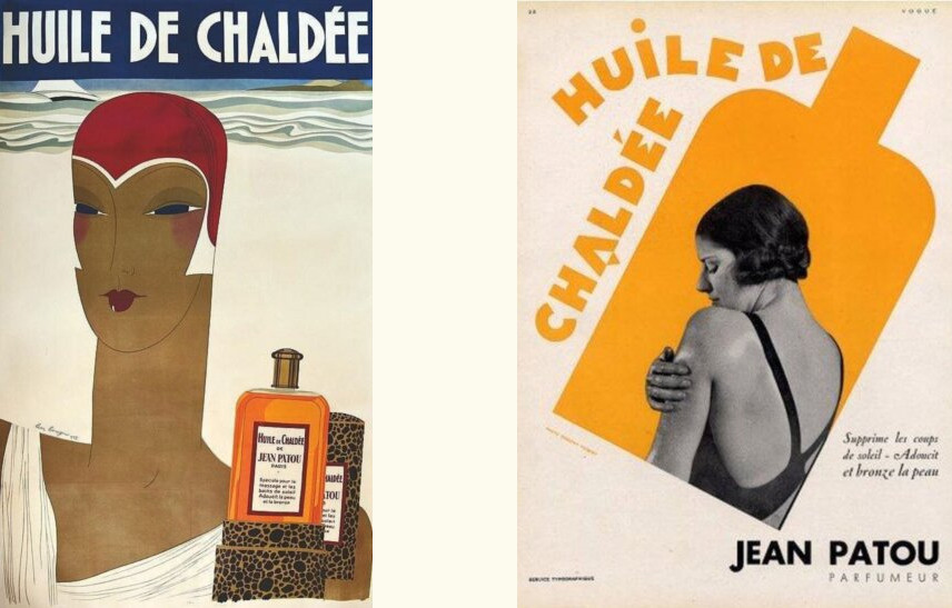 Уже к концу 1920-х производители косметики начали выпускать масла для загара, обещавшие ускоренное потемнение кожи. Первопроходцем стал Жан Пату с его Huile de Chaldée, а в середине 1930-х вышло и первое средство с солнцезащитным фильтром в составе. Реклама обещала, что продукт быстро обеспечит ровный и темный загар, одновременно защитив от ожогов.