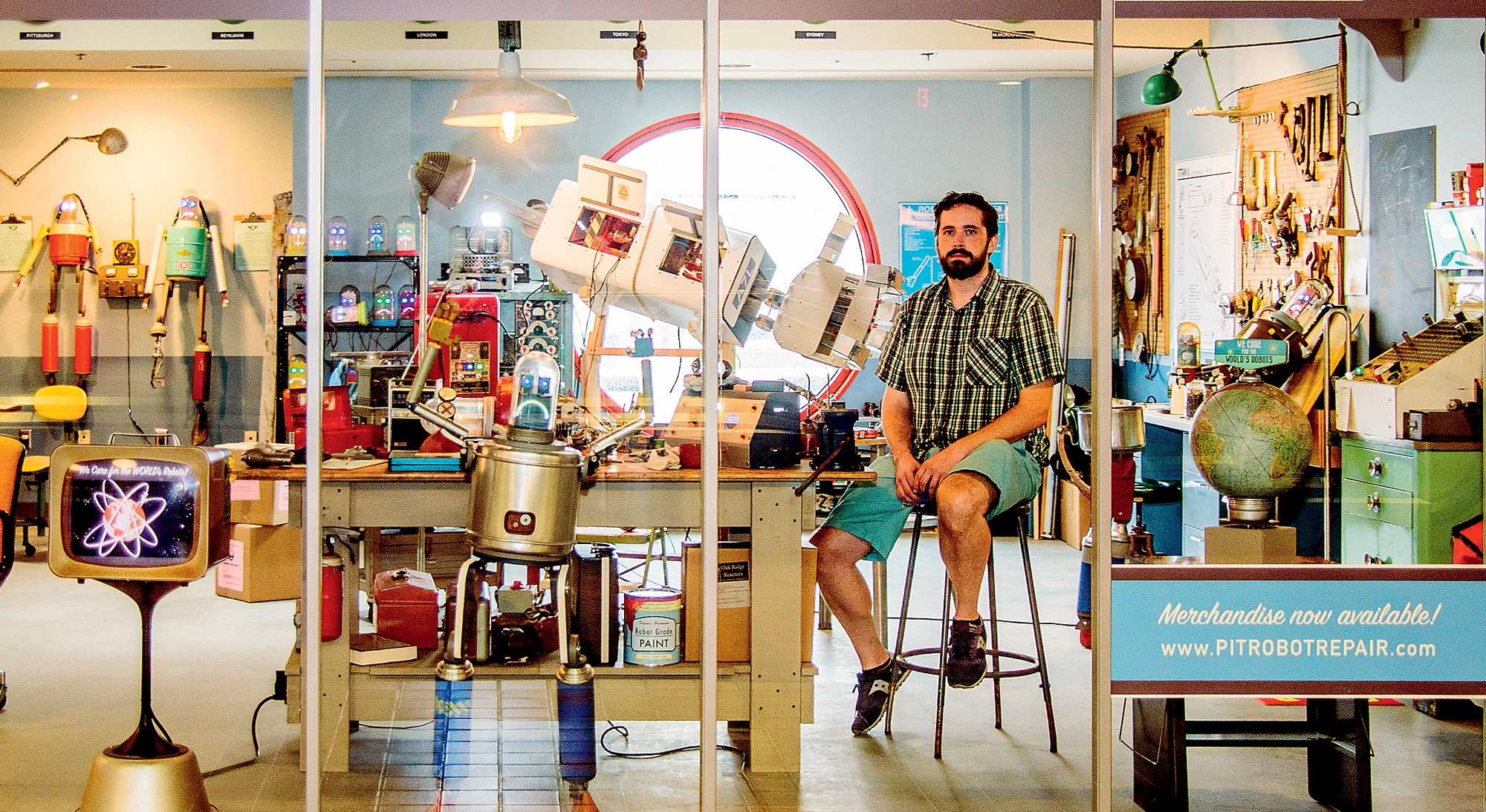 В зоне посадки Питтсбургского международного аэропорта в ряду магазинов между выходами А10 и А12 одна витрина привлекает особое внимание пассажиров, ожидающих очереди на выход. «Мастерская ремонта роботов Фрейли» – самая любимая публикой работа местного художника – впервые открылась здесь в 2016 году и с тех пор то и дело напоминает о себе автору. «Это всегда очень волнующе и радостно – получать письма от случайных людей, которые оказались в аэропорту и просто решили написать, что им понравился магазинчик», – рассказал нам Тоби Фрейли, создатель и владелец мастерской.