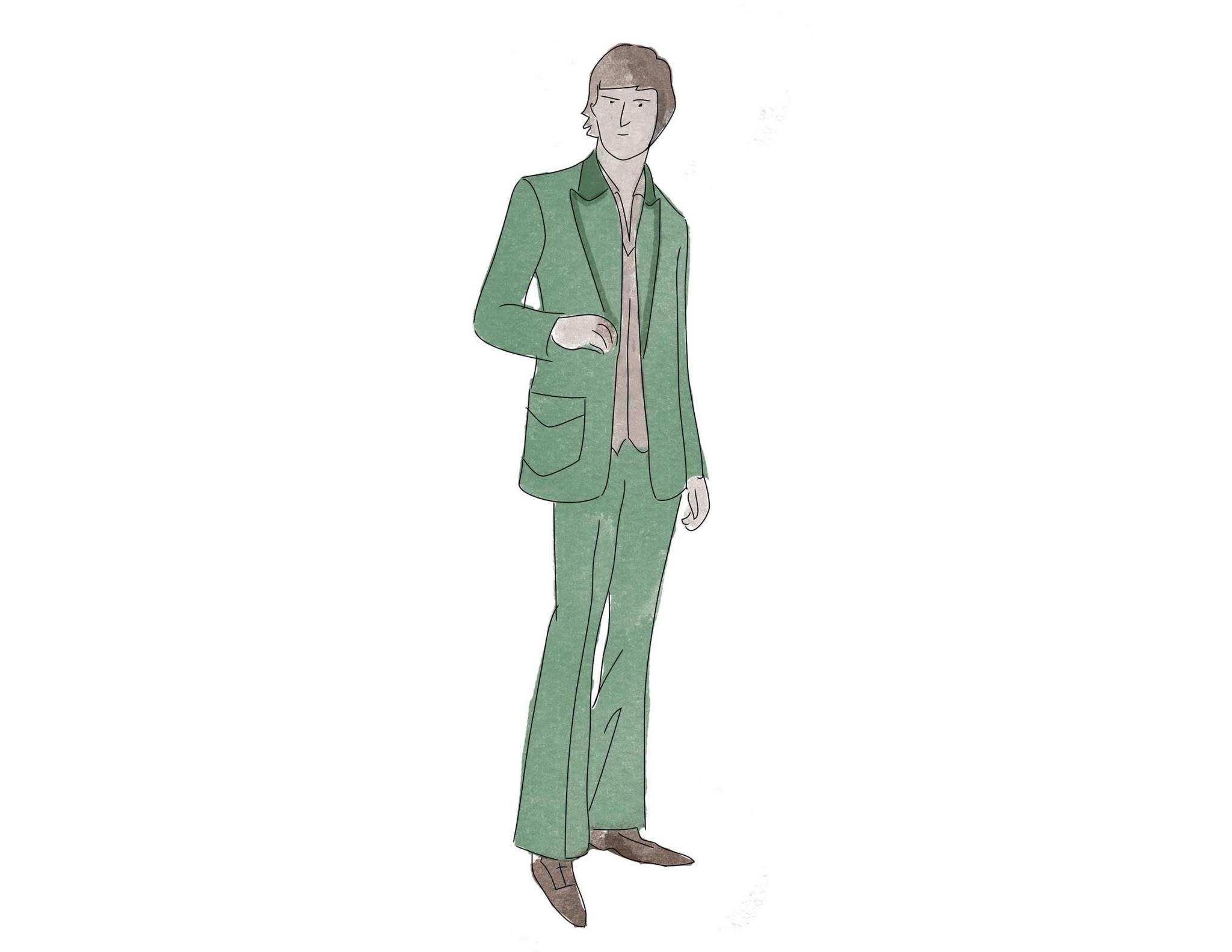 Эпоха рока и фанка не могла не повлиять и на классический костюм. Лацканы сильно расширяются, входит в моду заостренная форма. Плечо естественного размера выполняется прямо или в форме пагоды. Пиджаки в целом приобретают больше структурности, увеличивается их длина. Брюки клеш с завышенной талией — обязательная примета времени.