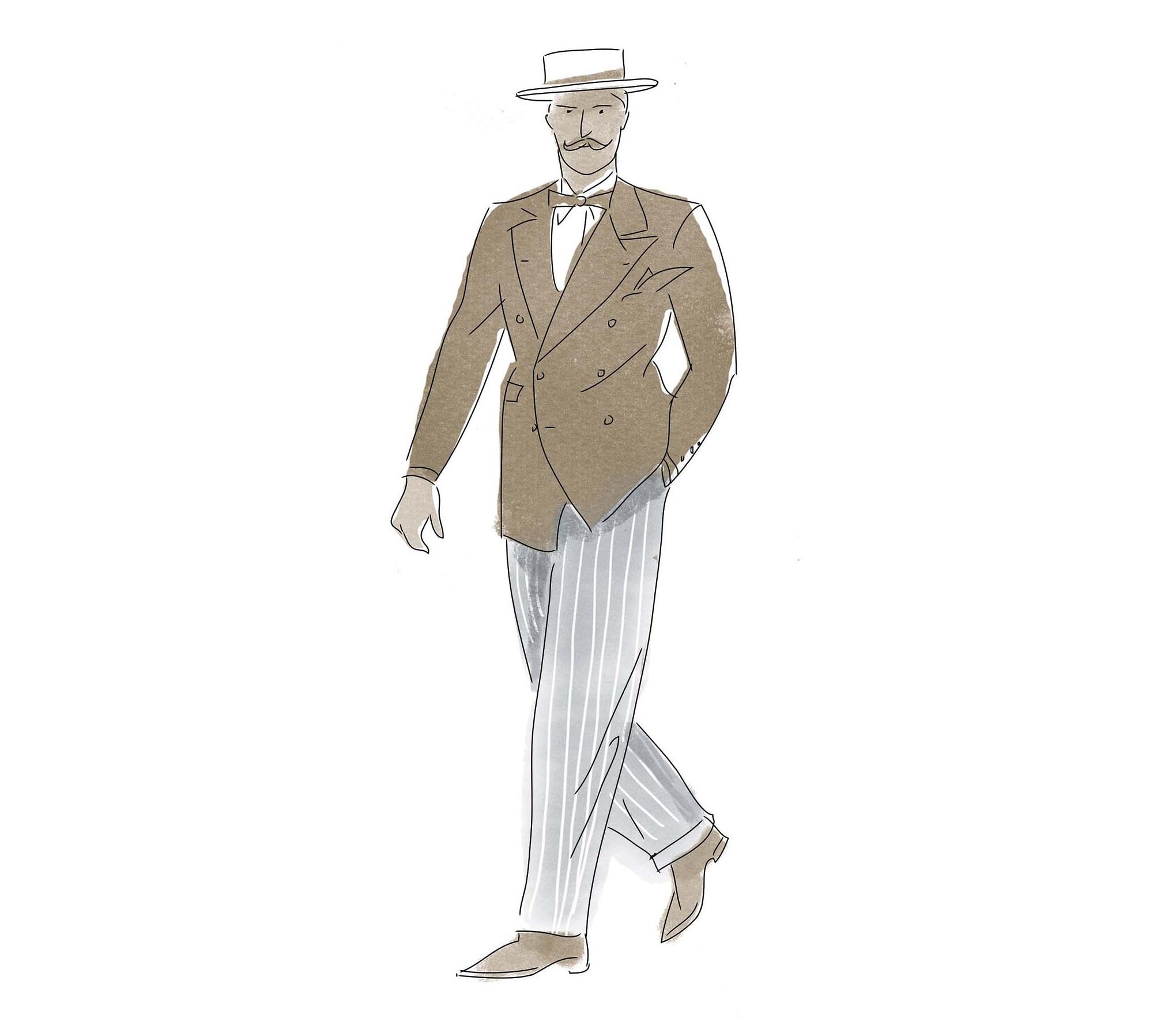 Для этой эпохи был характерен ультрамаскулинный силуэт «драпированного кроя». Преобладали двубортные костюмы, значительно расширенные в области груди, с заметной фалдой (складкой) у проймы и узким низом. Брюки имели высокую талию, защипы и свободный прямой крой. Шляпа была неотъемлемой частью костюма.