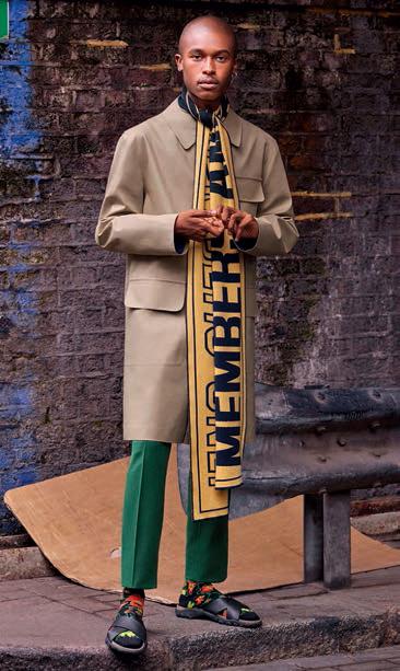 Тренч-футляр из непромокаемого хлопка с накладными карманами, шарф, вдохновленный образом футбольных фанатов, хлопковые брюки, шлепанцы с носками — шик эмигрантских кварталов.