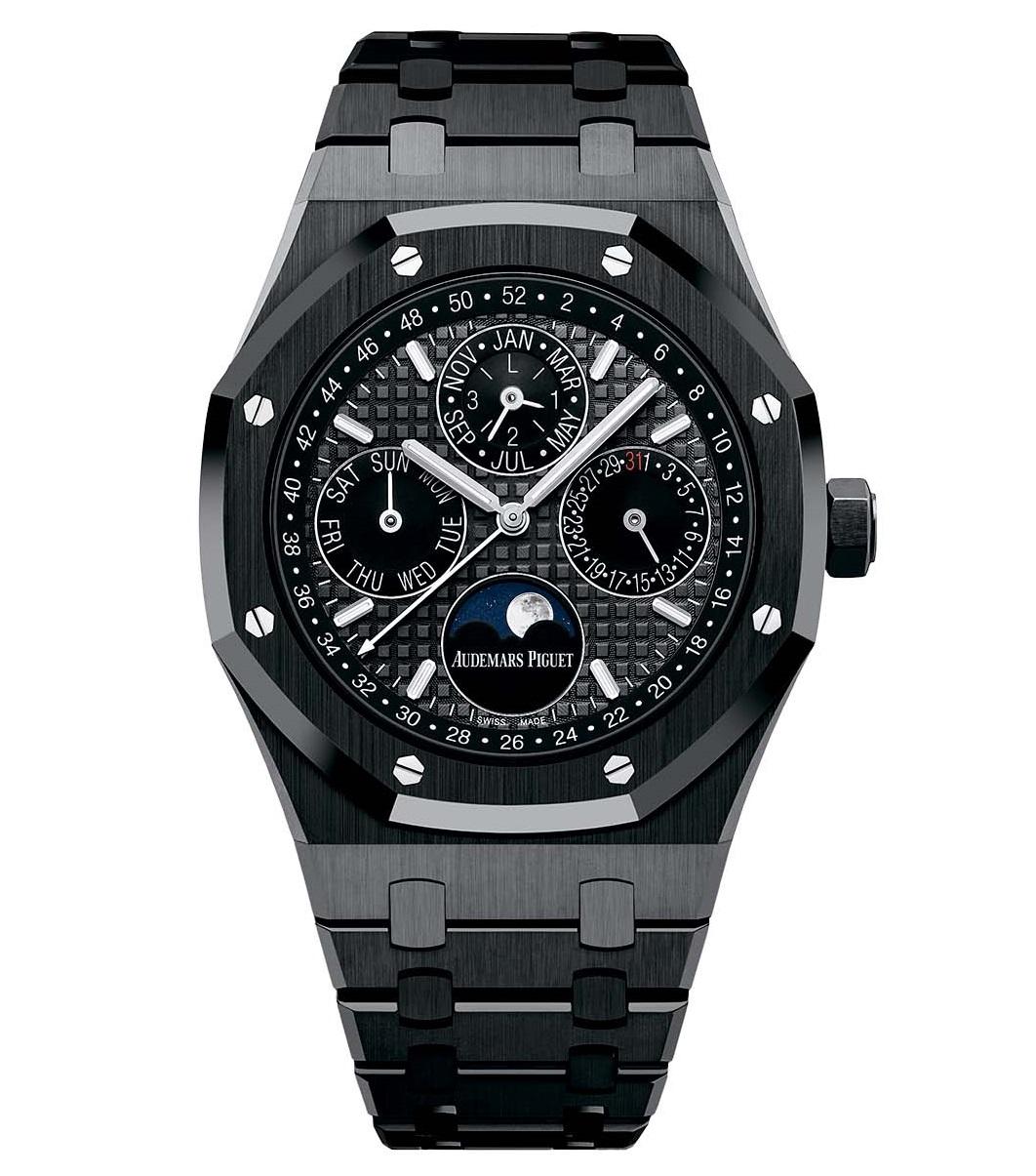 Вечность. Часы Royal Oak ее несомненно заслуживают. И речь не столько о вечном календаре фирменной конструкции, одном из лучших механизмов в своей категории, сколько о практически вечном материале, из которого изготовлен корпус и браслет часов, — высокотехнологичной циркониевой керамике. Черная керамика делает часы импозантными, вполне скромными, но проникнутыми пафосом, поскольку изготовление и отделка множества керамических деталей приблизили эти часы по стоимости к такой же цельнозолотой модели.