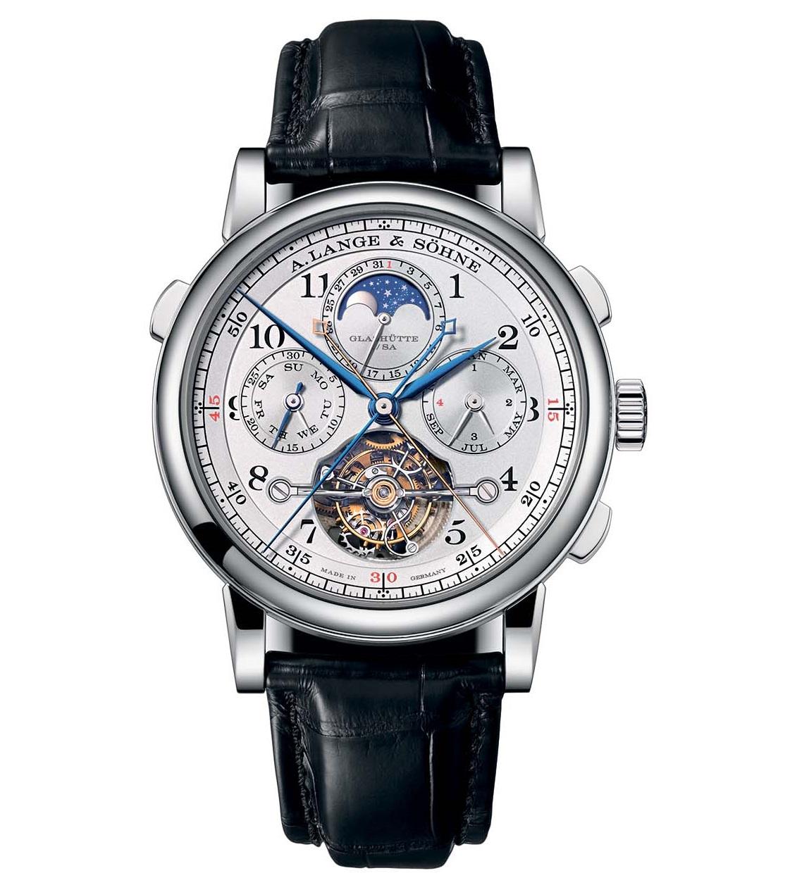 Упустить из виду факт выхода этих часов было невозможно — их исполинский макет фигурировал в самом центре стенда саксонской мануфактуры на Женевском салоне. Уже по макету можно было оценить грандиозность замысла часов с фузейно-цепной передачей, турбийоном, вечным календарем и хронографом, который дополнен сплит-функцией. Не менее впечатлила уникальная деталь, которую приятно рассматривать на часах вживую, — это изящно изогнутый, но при этом обработанный зеркальной плоской полировкой мост турбийона.