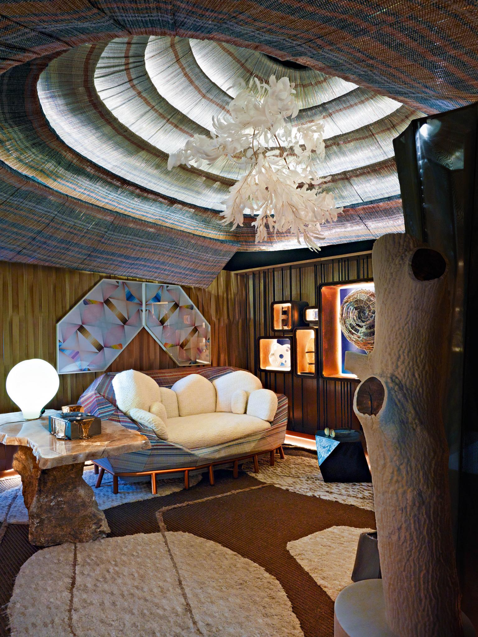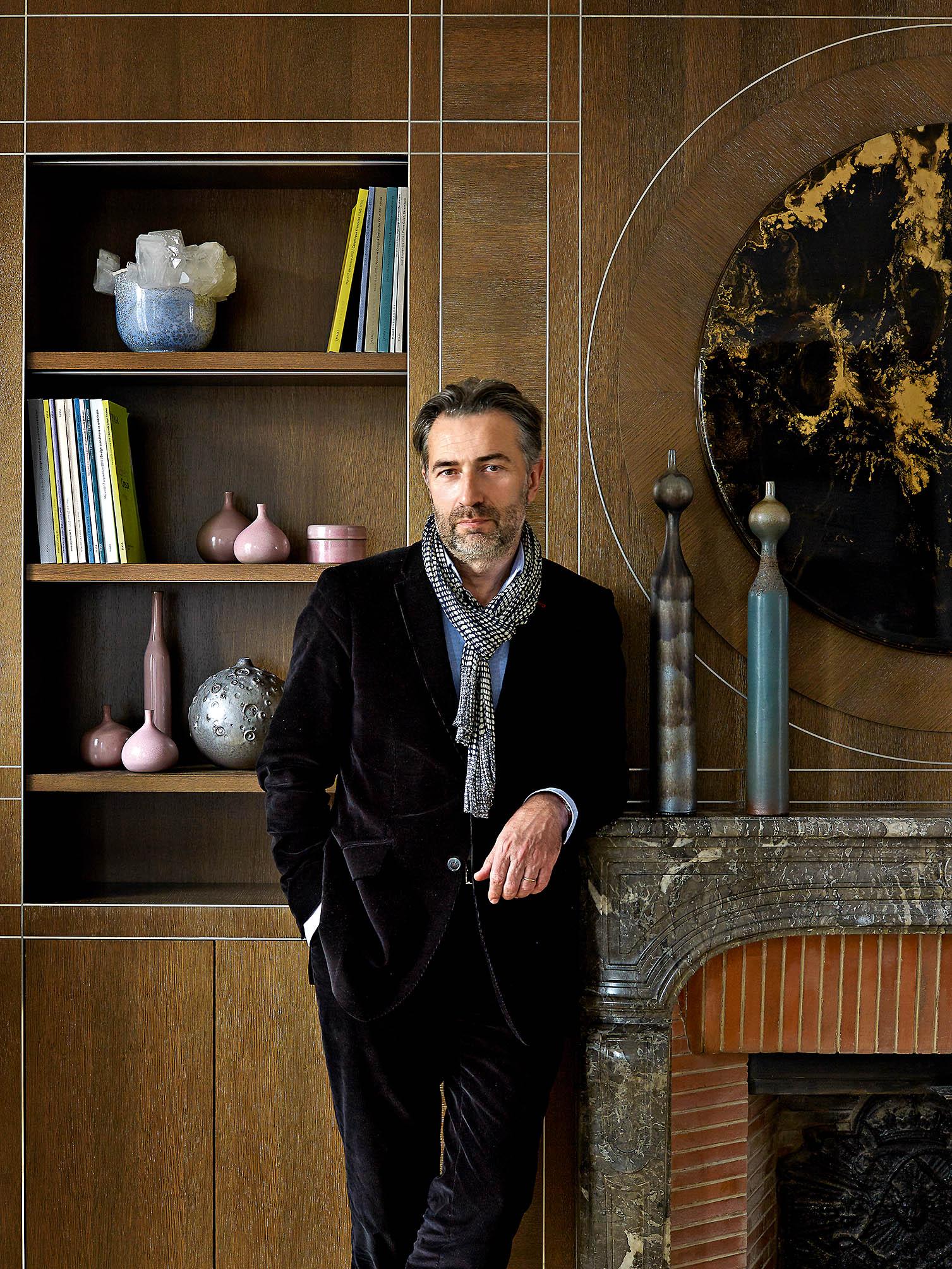 Прошлой осенью на выставке AD Interiors в Париже, которая ежегодно представляет лучших интерьерных дизайнеров мира, комната Studiolo Фабриса Оссе выделялась сложностью идеи и невероятной трудоемкостью исполнения даже среди этих сrème de la сrème декораторского искусства. Для своего стенда Фабрис придумал не только всю мебель, свет, камин под вуалью из перфорированного металла, но даже ткань, которой был обтянут подымающийся ярусами потолок. Ткань сплели вручную в Калькутте из алюминиевых и медных нитей, перемежая их с буклированной шерстью. Талант и компетентность декоратора проявляли себя не только в сочетании предметов, но и на уровне переплетения волокон!