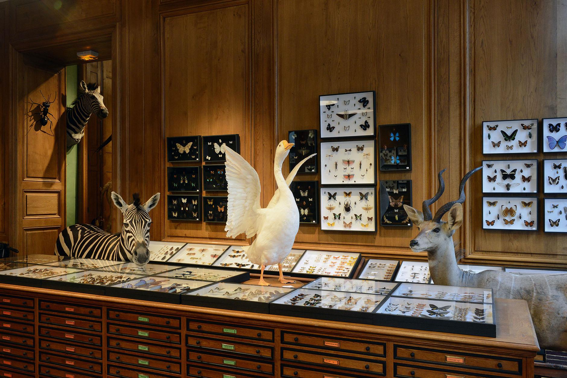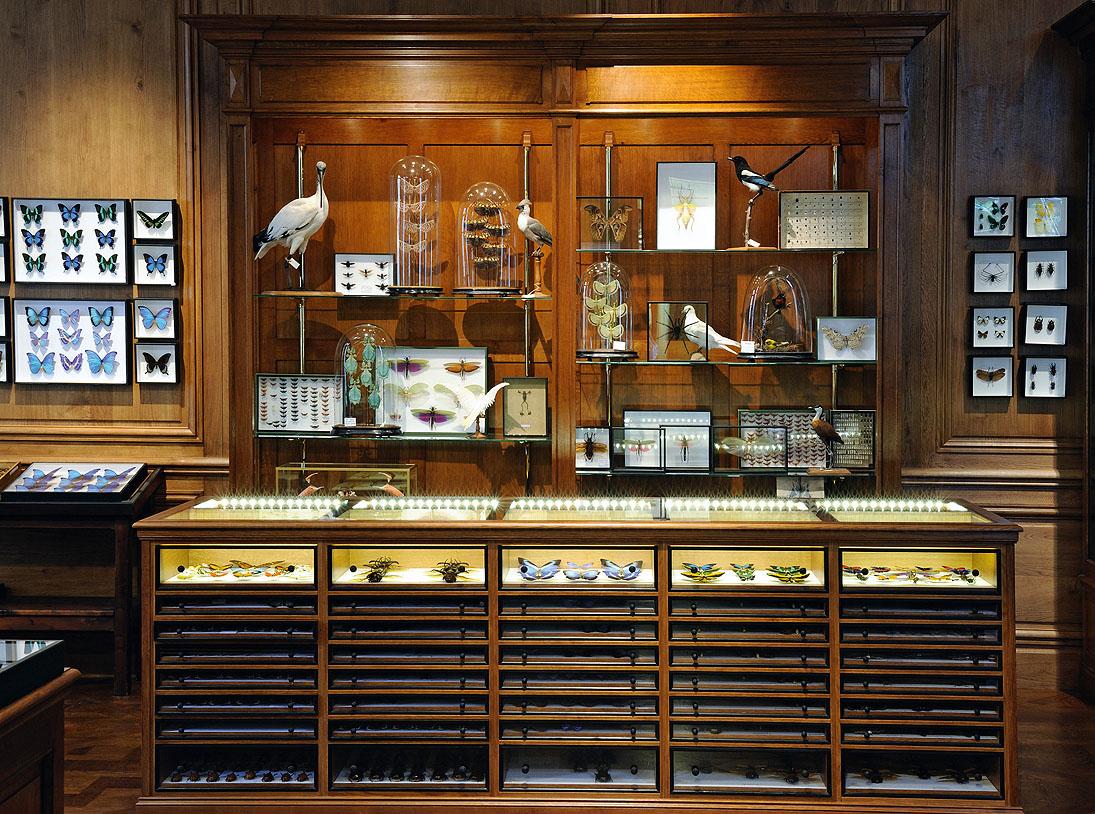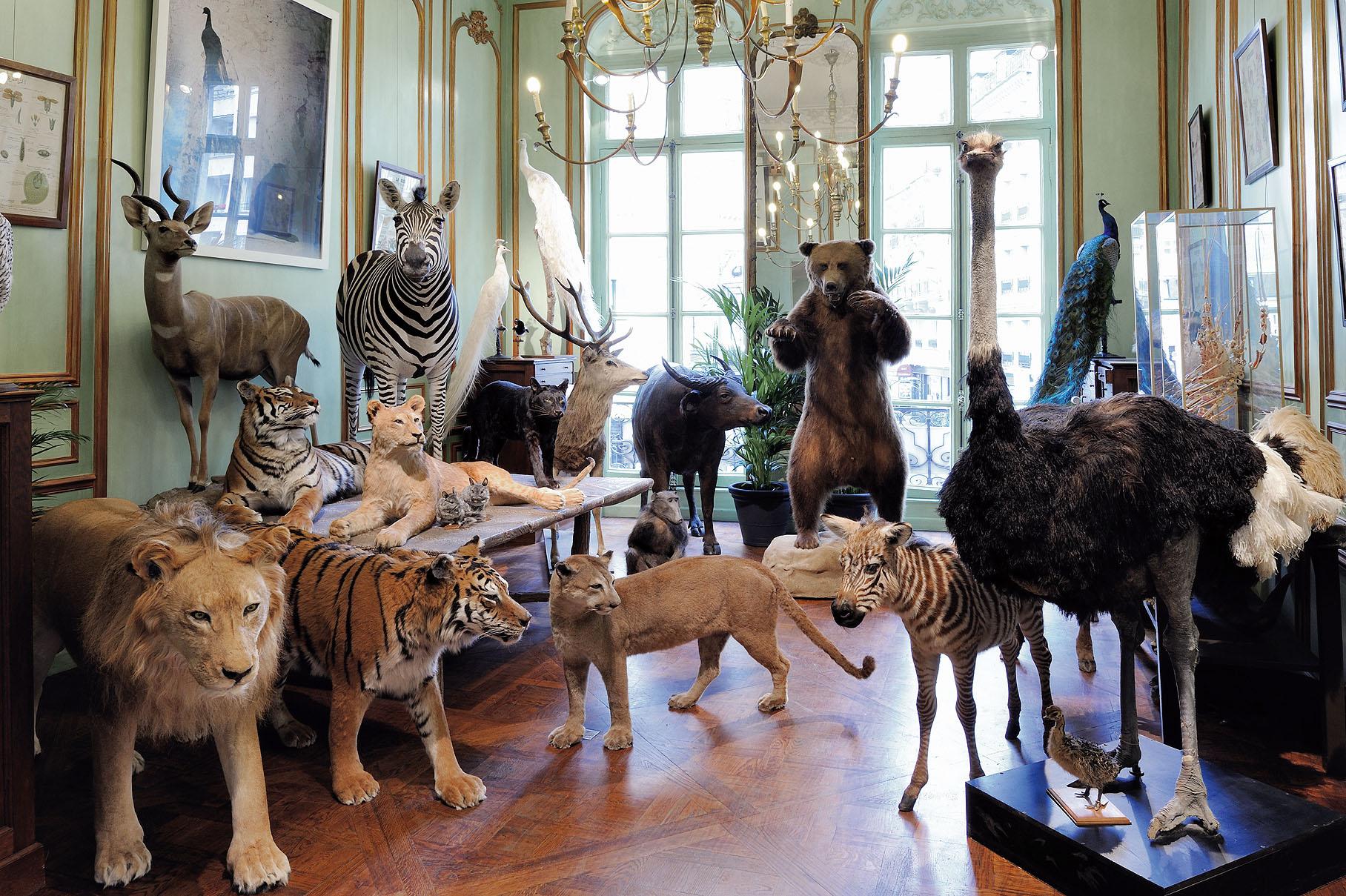 Чучела животных в магазине Deyrolle застыли в картинных позах на фоне стен зеленоватого оттенка абсента