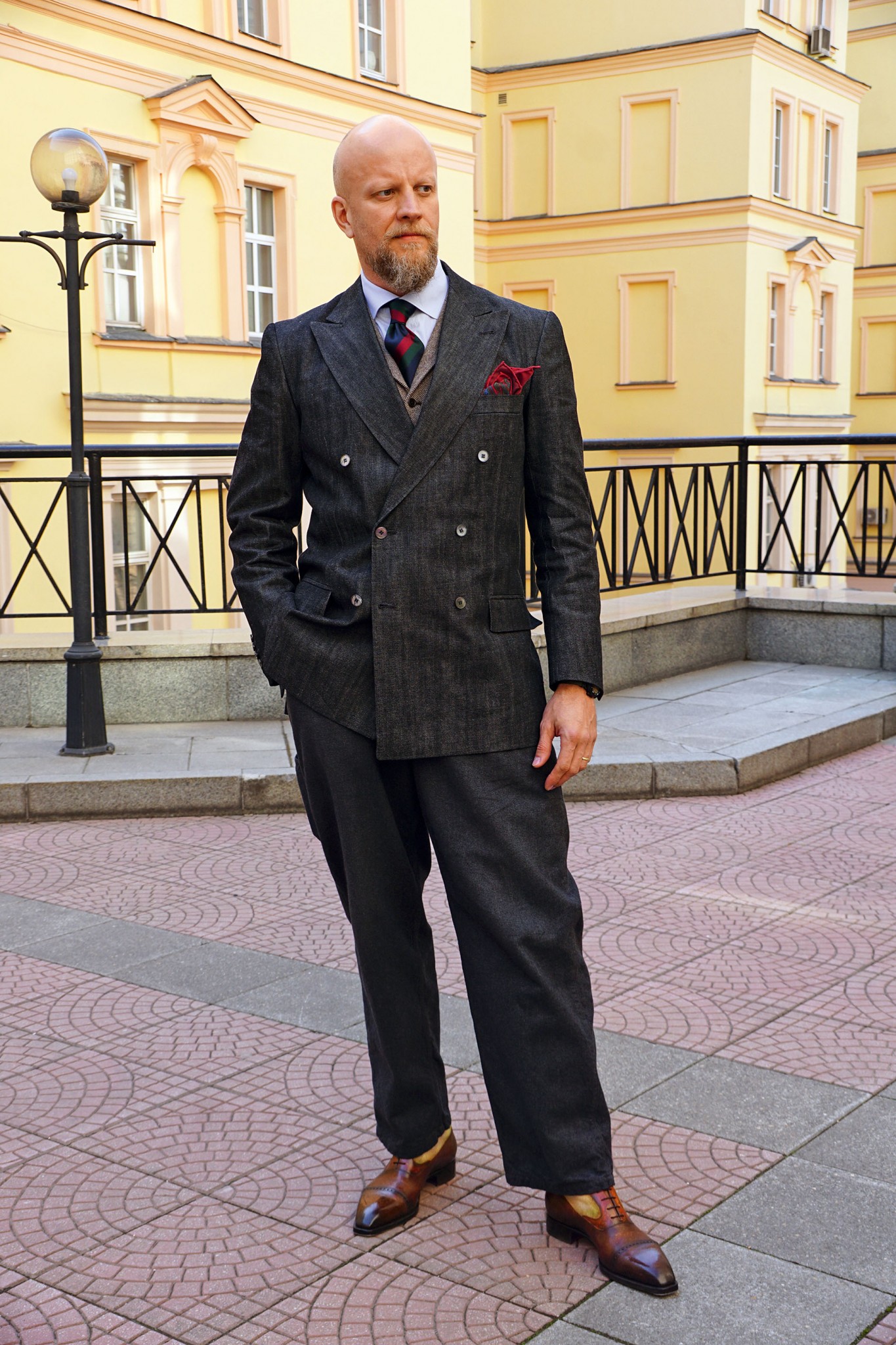 Двухметровый гигант в двубортном костюме из денима — нечастое зрелище на улицах Москвы. Нам удалось познакомиться с Александром на премии Shoesing Awards 2018, где он выступил приглашенным судьей.