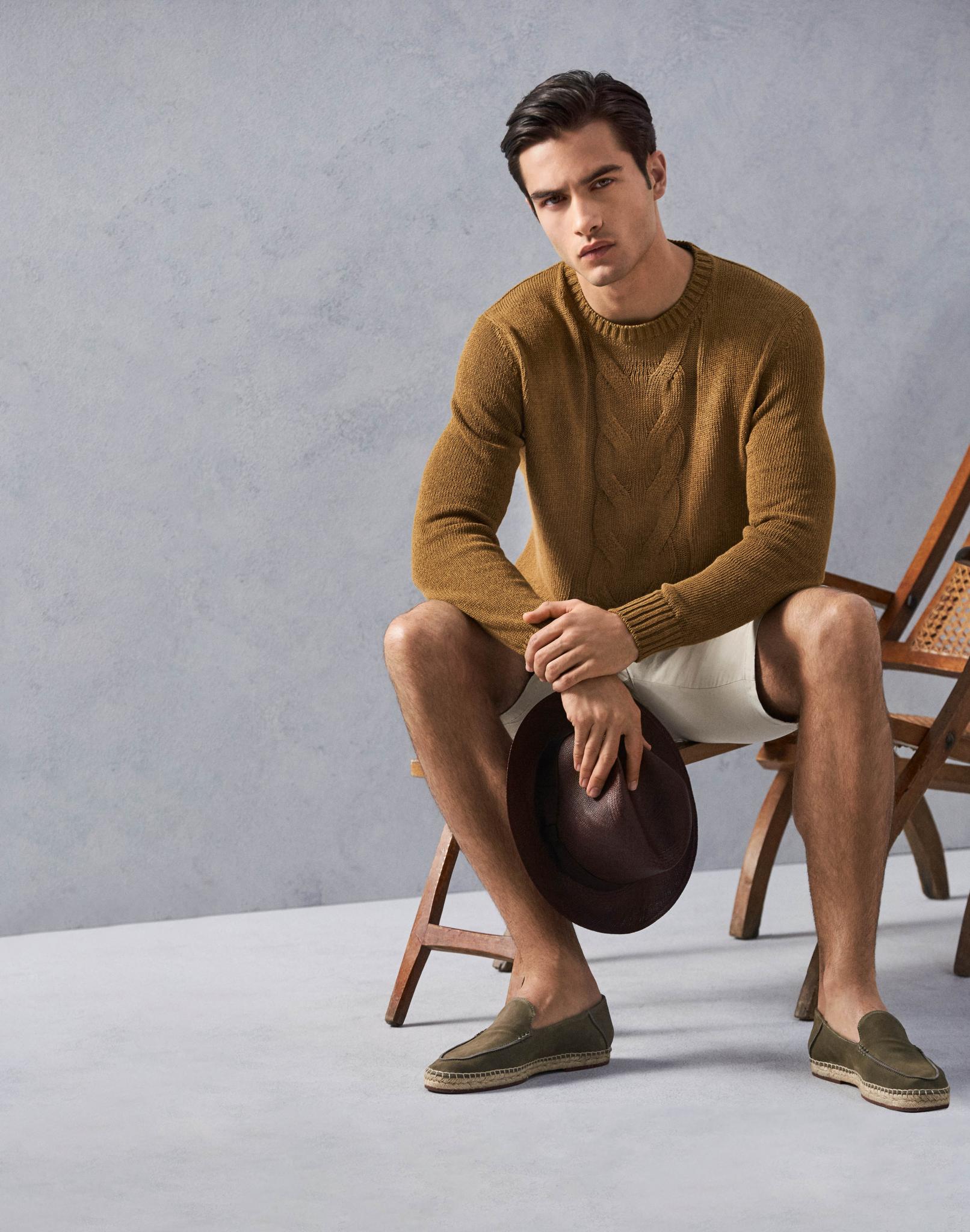 Эксперты по люксовому трикотажу Loro Piana предлагают надеть этой весной вместо привычных футболок и поло джемперы, причем зауженные и укороченные. Флагманская модель Sweater S Jacket 2B из кашемира и шелка значительно приталена, чтобы выгодно подчеркнуть фигуру владельца и отлично смотреться даже с шортами. Не отстает марка и от тренда на спортивную одежду — линия трикотажа Matchplay выпущена в честь коллаборации с Кубком Райдера, для которого Loro Piana создавали форму сборной Европы. Такие свитеры на молнии будут уместны не только на поле для гольфа, но и в городской среде. Лейтмотивом даже в спортивном стиле служит неброская вневременная элегантность, эстетика в сочетании с практичностью. Запатентованные шарфы Aylit представлены в сдержанной серо-голубой гамме и выполнены из невесомого бленда кашемира и шелка. В центре весенне-летней обувной коллекции бренда — эспадрильи на джутовой подошве, дополненной каучуковой профилактикой. Верх кроят не только из привычного льна, но и из кожи аллигатора и водоотталкивающей замши. Верхняя одежда на этот сезон — бомберы, что на волне нового интереса к 1950-м неудивительно. Самый заметный