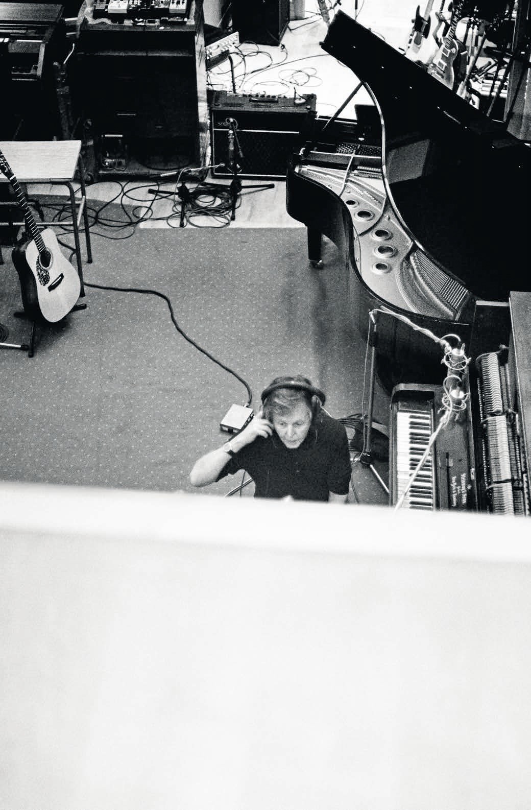 Эта сцена почти такая же сюрреалистичная, как и сам факт того, что я нахожусь в компании настоящей легенды. На книжных полках здесь стоят те же книги, что и у тысяч людей во всем мире — увесистый экземпляр «Антологии „Битлз“», книга рецептов Линды Маккартни, — но в этом доме… ну, это выглядит как-то немного по-другому. Бесконечно очаровательная звезда извиняется за 3D-версию собственного лица на полке («Немного странно, что оно здесь…»), охотно демонстрирует нам студию и сыплет историями о своем участии в величайшей группе всех времен. И все здесь наполнено особой магией.