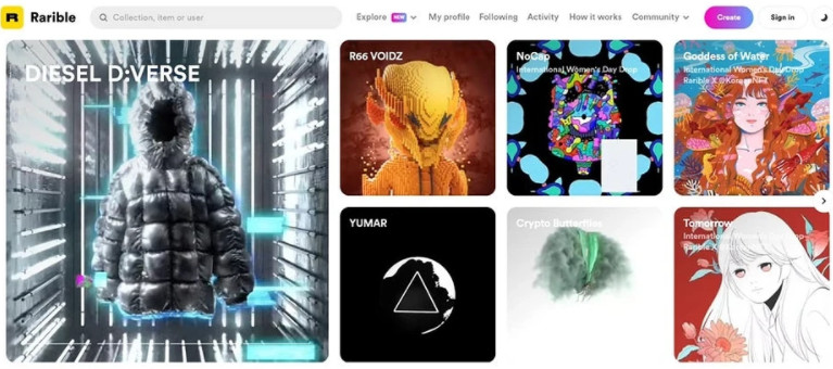 Это один из крупнейших децентрализованных маркетплейсов, на котором представлены все виды цифрового искусства. Здесь можно покупать и продавать картины, коллекционные карточки и игровые предметы, музыку, аватары и любые другие виды цифрового искусства. Есть здесь и возможность торговли объектами реального мира, но все риски за такие транзакции лежат на участниках сделки.