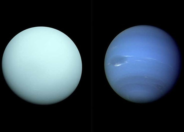 Однако цвет обеих планет все же отличается друг от друга, кроме того, есть различия и в наблюдаемых деталях атмосфер. Например, облака метана могут находиться на Уране и Нептуне на разных высотах, кроме того, в атмосфере Нептуна было замечено несколько темных пятен, наиболее известным из которых является антициклон Большое темное пятно, а на Уране наблюдалось лишь одно темное пятно. Также Нептун кажется менее ярким при наблюдениях на длинных длинах волн, а в ультрафиолетовом диапазоне отражает больше света, чем Уран.