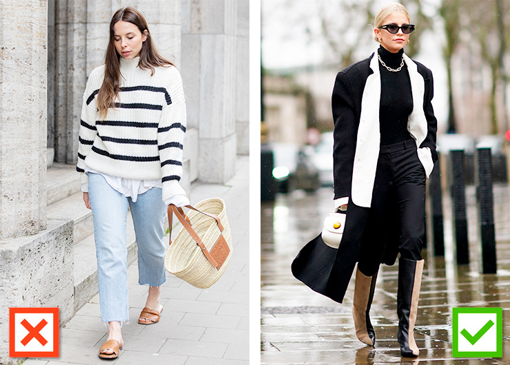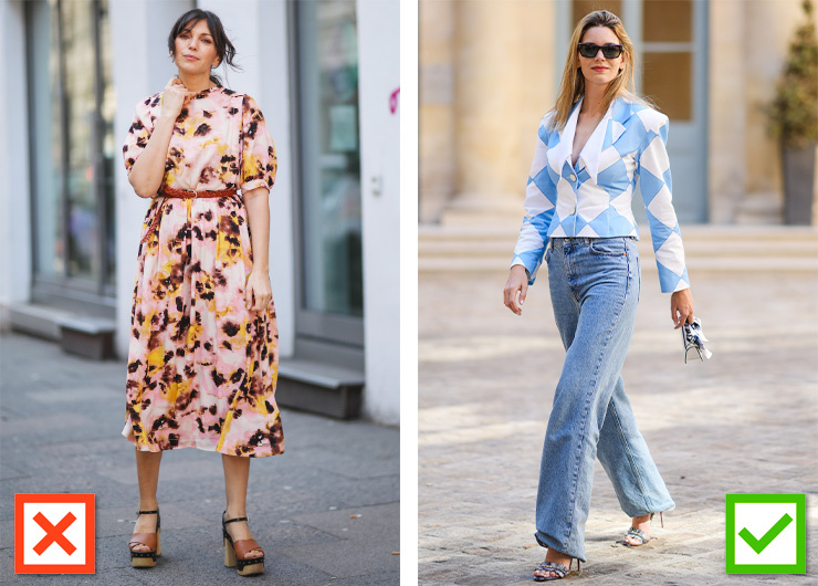 В образе многое зависит от расположения цветов. Так, деля фигуру на горизонтальные цветовые блоки, мы зрительно съедаем сантиметры роста и расширяем фигуру. Конечно, если у тебя комплекция Беллы Хадид или Кендалл Дженнер, бояться нечего, в противном случае лучше избегать подобных сочетаний. Располагай цвета вертикально, как показано на картинке справа — такой прием поможет тебе выглядеть гораздо стройнее.