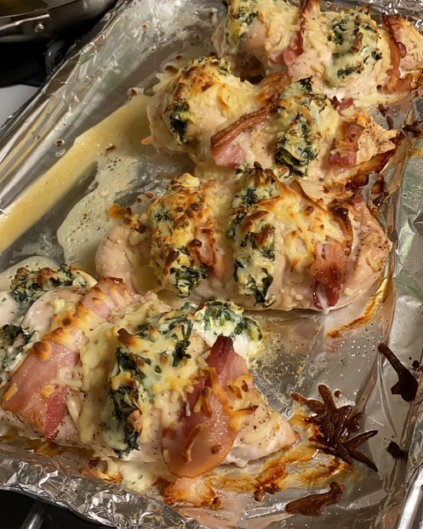 В миске смешай сливочный сыр, шпинат, артишоки и ½ стакана моцареллы. Приправь солью, черным перцем и щепоткой хлопьев красного перца. Нашпигуй половину грудок смесью сливочного сыра и заполни оставшиеся грудки кусочком бекона. Сверху посыпь оставшейся ½ стакана моцареллы и сбрызни маслом.