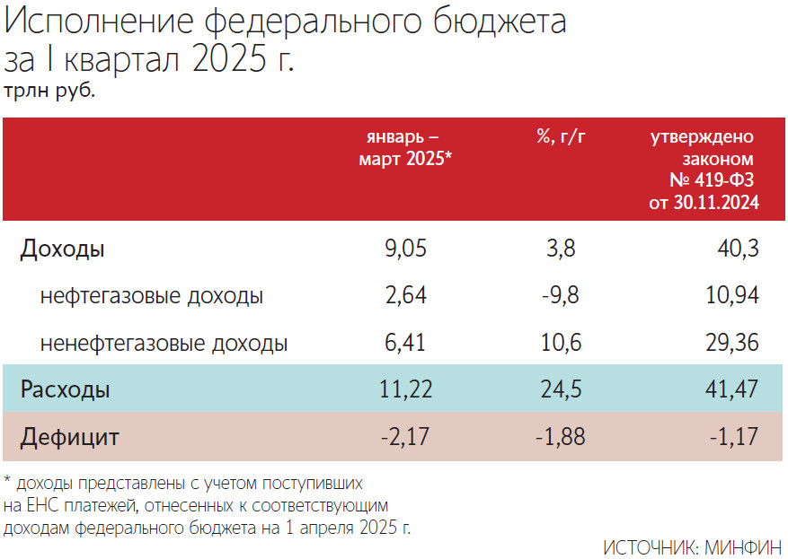 Динамика исполнения расходов замедлилась в феврале – марте (+9,1% год к году) после ускоренного финансирования в январе 2025 г. (+64,1%), связанного с оперативным заключением контрактов и авансированием по отдельным госконтрактам, отмечается в пресс-релизе Минфина. В целом по итогам года министерство ожидает объем расходов в пределах годового плана, заложенного в закон (41,47 трлн руб.). При этом на портале «Электронный бюджет» роспись до конца года увеличена до 41,89 трлн руб., а дефицит в конце марта превышал 5 трлн руб. Отдельные расходы текущего года профинансированы за счет авансового перечисления дополнительных ненефтегазовых доходов, сформированных в конце 2024 г., отмечает Минфин.