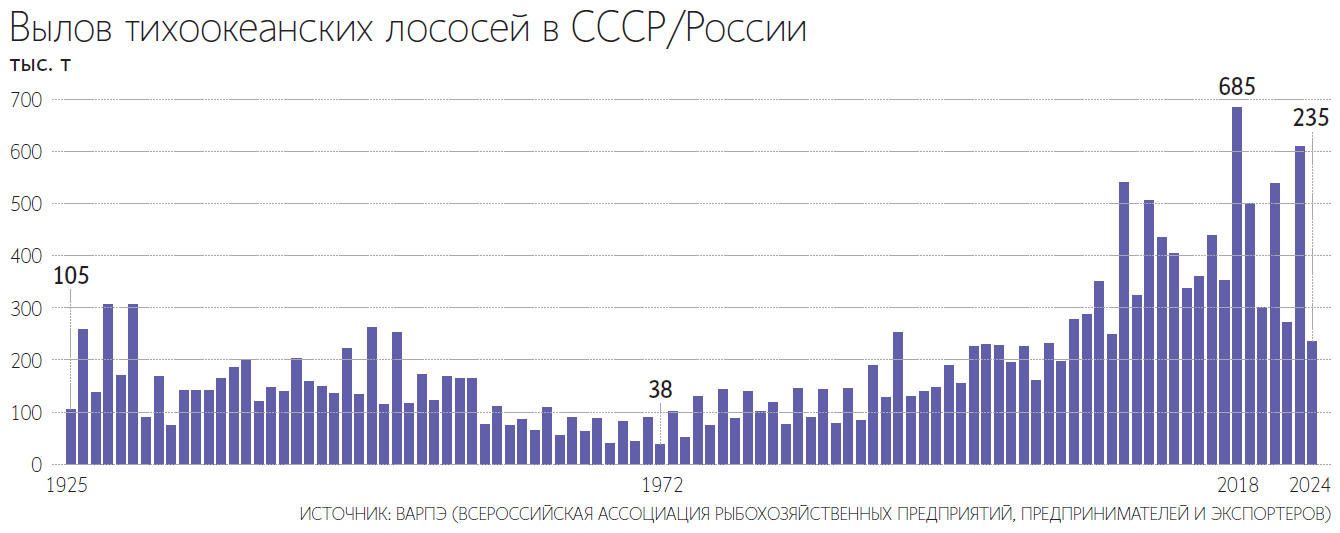 В 2024 г. вылов лососевых стал худшим за последние 20 лет, составив 235 500 т. Для сравнения: в 2018–2023 гг. объем добычи, по данным ВАРПЭ, варьировался от 272 000 до 685 000 т. Лососевый промысел характеризуется двухгодичной цикличностью, объясняет Зверев. По его словам, в последнее время в четные годы уловы лососей ниже, чем в нечетные. Последний нечетный год – 2023-й – оказался одним из рекордных. Тогда было добыто 609 000 т лососевых.