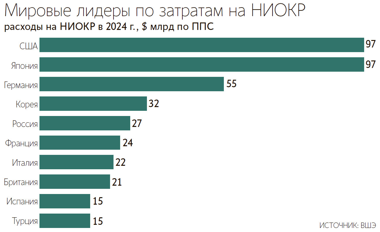 Россия входит в пятерку стран – лидеров по объемам бюджетных вложений в НИОКР, свидетельствуют данные Института статистических исследований и экономики знаний (ИСИЭЗ) ВШЭ. В 2024 г. расходы на гражданские исследования (без учета оборонных) составили $26,9 млрд по паритету покупательной способности, согласно данным главного эксперта ИСИЭЗ ВШЭ Татьяны Ратай. Нас опережают США ($97,3 млрд), Япония ($97 млрд), Германия ($55 млрд) и Корея ($32 млрд).