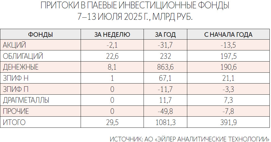 Инвестиционные фонды облигаций на фоне ожиданий дальнейшего снижения ключевой ставки вытеснили фонды денежного рынка: за неделю с 7 по 13 июля чистый приток средств инвесторов в облигационные ПИФы составил 22,6 млрд руб., а в денежные – 8,1 млрд руб., свидетельствуют данные InvestFunds. Это максимум с начала года. В результате этого впервые сменился лидер по притокам – с начала года в фонды облигаций пришло 197,5 млрд руб., а фонды денежного рынка сместились на 2-е место (+190,6 млрд руб.), пишут аналитики компании «Эйлер» в новом обзоре.