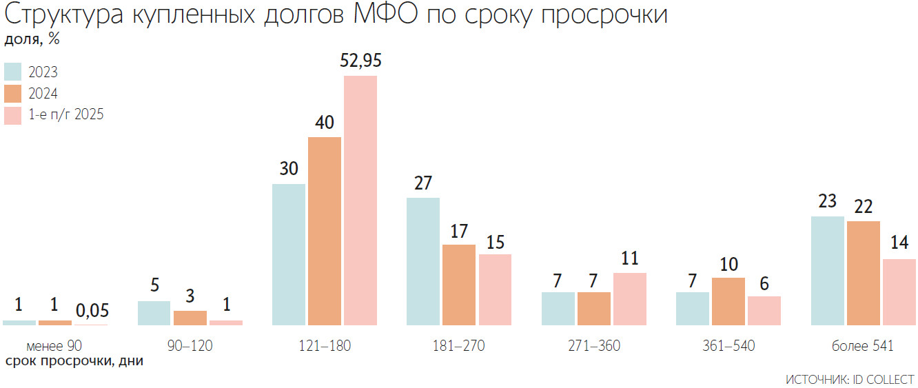 Доля молодой просрочки заемщиков, которую микрофинансовые организации (МФО) продали коллекторам, по итогам первого полугодия 2025 г. впервые превысила половину от общего объема закрытых сделок и достигла 54%. В деньгах показатель составил 26,68 млрд руб. Такие данные приводит сервис по возврату просроченной задолженности ID Collect, статистика которого основана на сведениях от всех электронных торговых площадок и прямых сделок. Общий объем закрытых сделок за январь – июнь составил 49,4 млрд руб. против 42 млрд руб. за аналогичный период прошлого года.