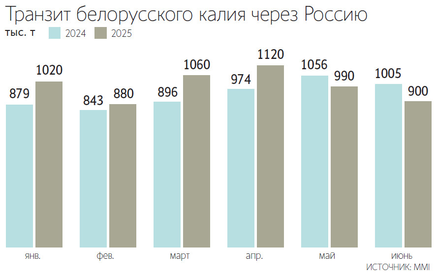 Основной объем транзитных поставок – более 5,4 млн т – шел через российские морские порты, следует из данных MMI. Более 500 000 т хлористого калия было поставлено напрямую по железной дороге в Китай через сухопутные погранпереходы. По сравнению с показателем января – июня 2024 г. объем прямого железнодорожного транзита снизился в 2,8 раза, а в июне 2025 г. таких поставок не было вовсе.
