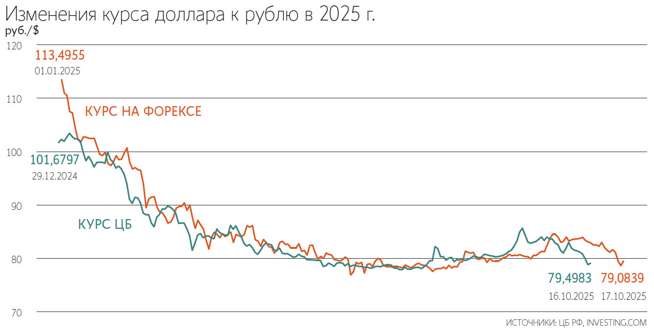 Но по сравнению с началом года официальные курсы от ЦБ все еще ниже на 22% и 13% соответственно. В конце 2024 г. – начале 2025 г. американская валюта стоила более 100 руб., европейская – более 105 руб. Опрошенные Банком России экономисты в октябре в очередной раз понизили прогноз по среднему курсу доллара до 85 руб. на этот год – в сентябре они ждали 85,5 руб., в июле – 87,3 руб. На 2026 г. стоимость доллара снижена до 94,6 руб. против ранних оценок в 96 руб. и 97,5 руб. соответственно.