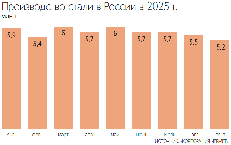 Производство стали в России в январе – сентябре 2025 г. составило 50,8 млн т, что на 5% меньше, чем за аналогичный период прошлого года. Такие данные приводит информационно-аналитическая компания «Корпорация Чермет». В сентябре выпуск стали снизился на 4% до 5,2 млн т, говорится в материалах компании.
